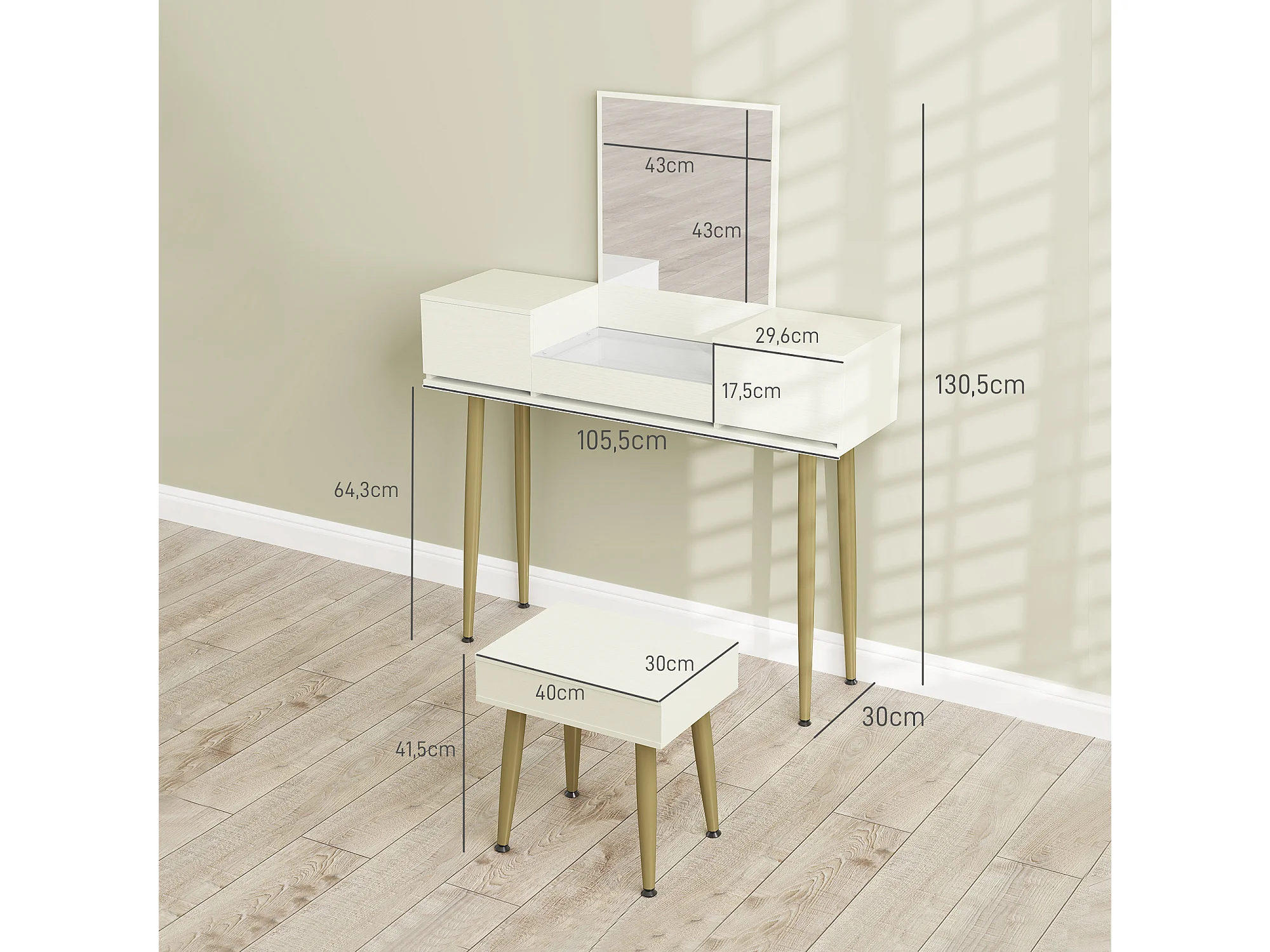 Ensemble coiffeuse tabouret design contemporain multi-rangement 4 tiroirs 4 étagères grand miroir blanc