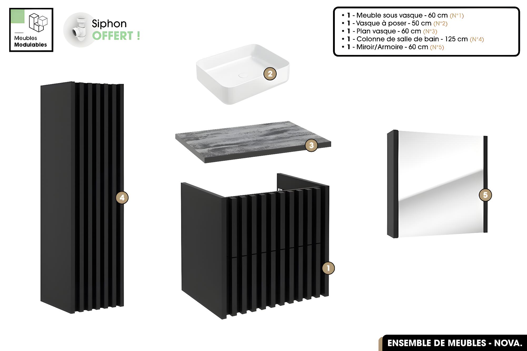Ensemble complet de salle de bain - Meuble - Colonne - Miroir - Vasque à poser avec Siphon OFFERT | NOVA | Noir | 60 x 56 x 45 cm