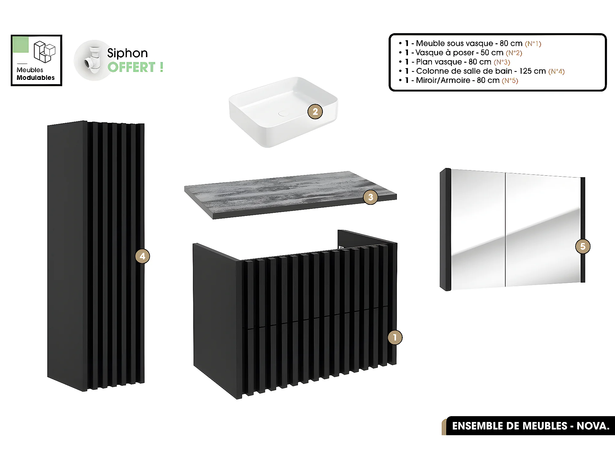 Ensemble complet de salle de bain - Meuble - Colonne - Miroir - Vasque à poser avec Siphon OFFERT | NOVA | Noir | 80 x 56 x 45 cm