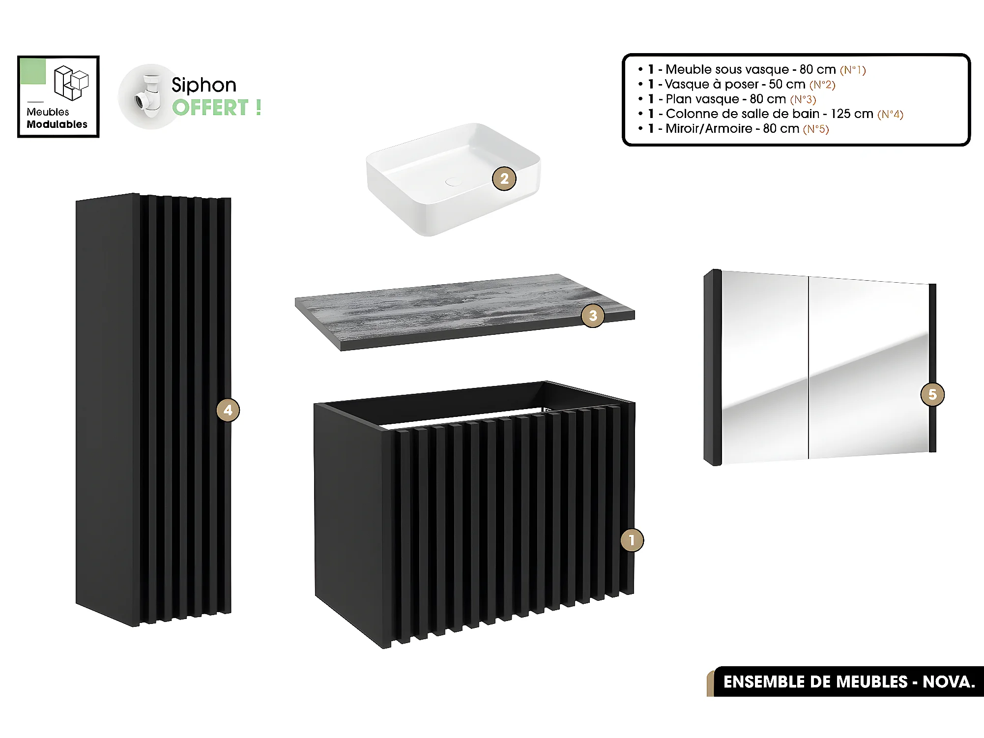 Ensemble complet de salle de bain - Meuble - Colonne - Miroir - Vasque à poser avec Siphon OFFERT | NOVA | Noir | 80 x 56 x 45 cm