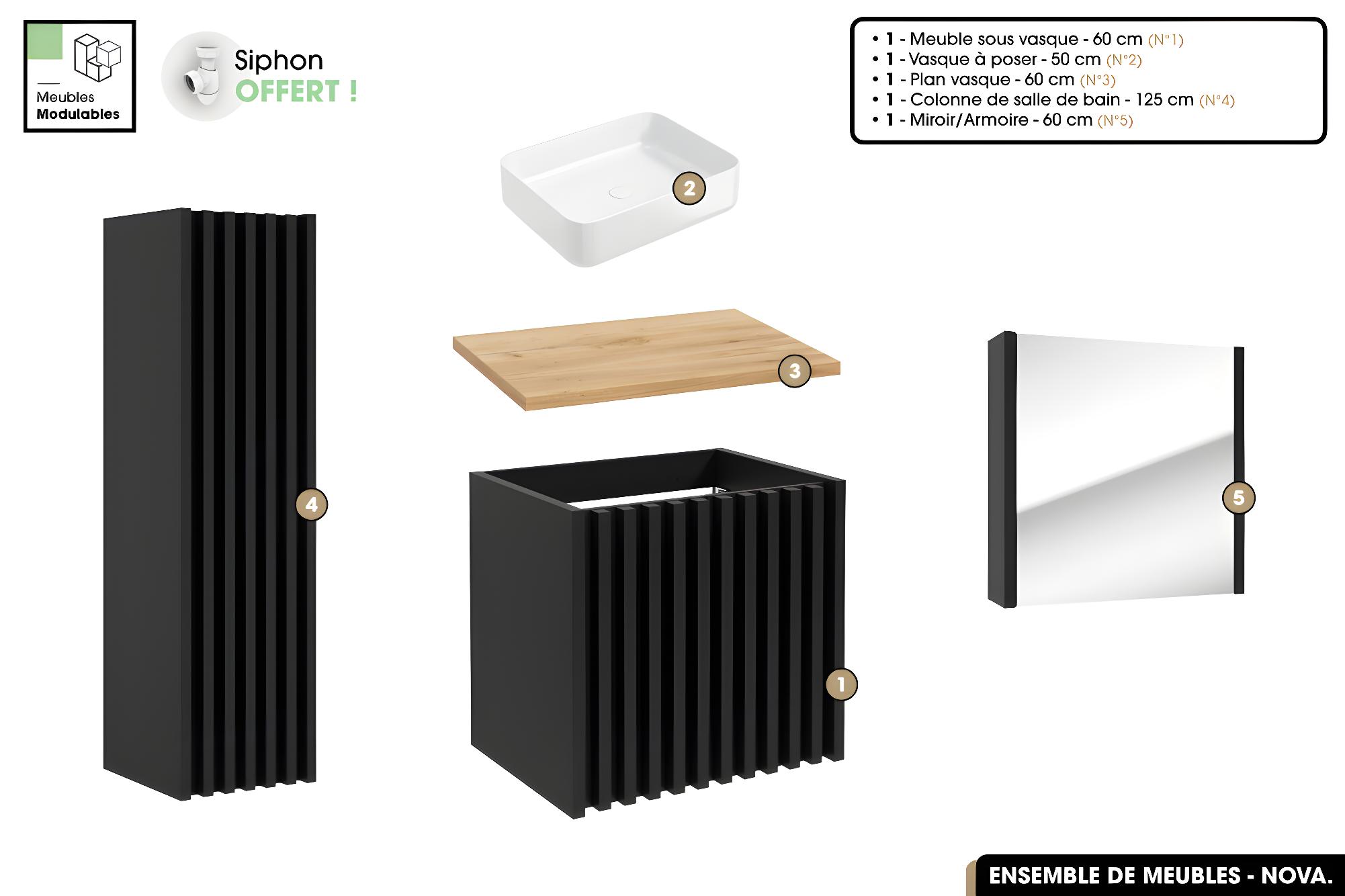 Ensemble complet de salle de bain - Meuble - Colonne - Miroir - Vasque à poser avec Siphon OFFERT | NOVA | Oak | 60 x 56 x 45 cm