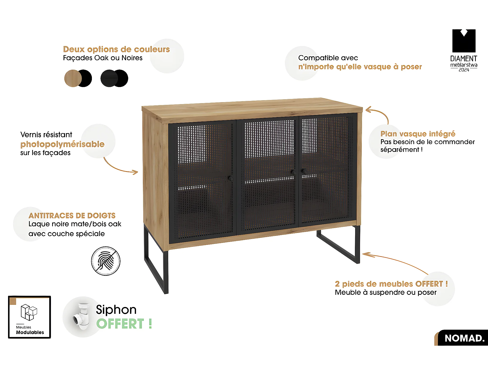 Ensemble complet de salle de bain - Meuble - Colonne - Miroir - Vasque avec Siphon OFFERT | NOMAD | OAK | 102 x 80 x 43 cm