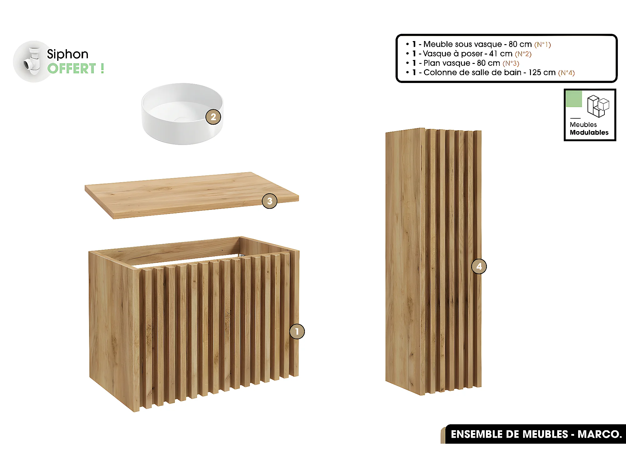 Ensemble complet de salle de bain - Meuble - Colonne - Vasque à poser avec Siphon OFFERT | MARCO | Oak | 80 x 56 x 45 cm
