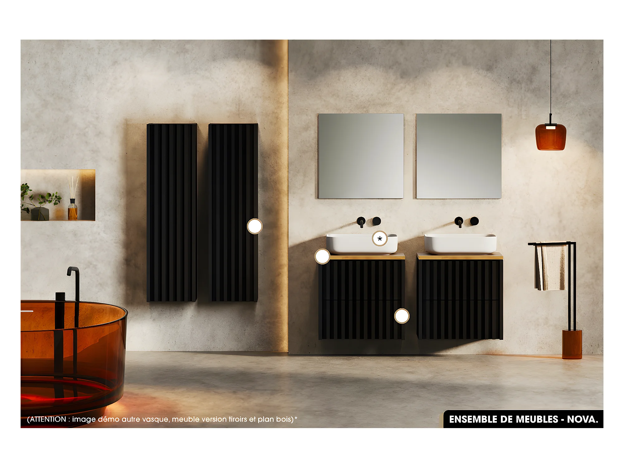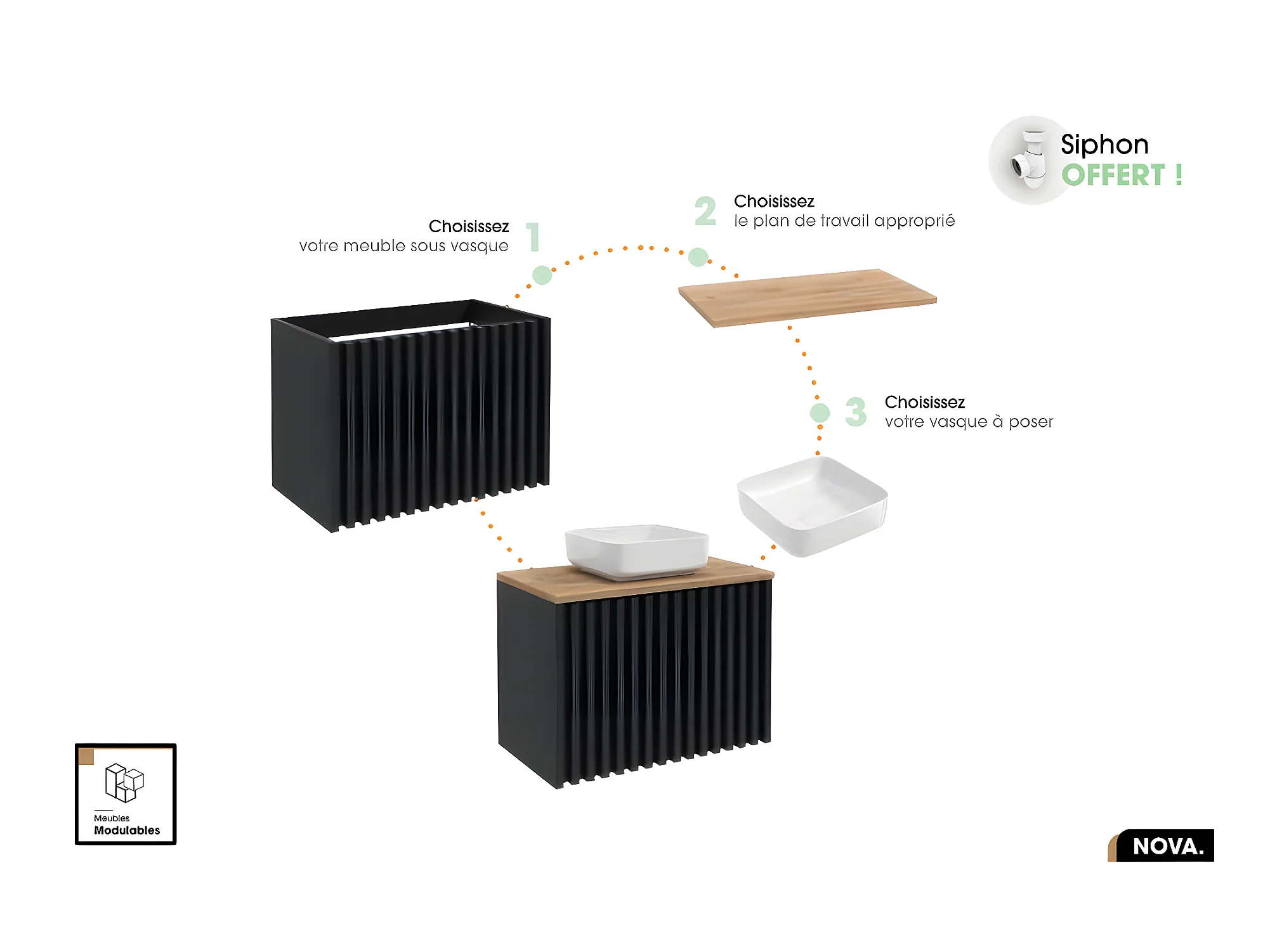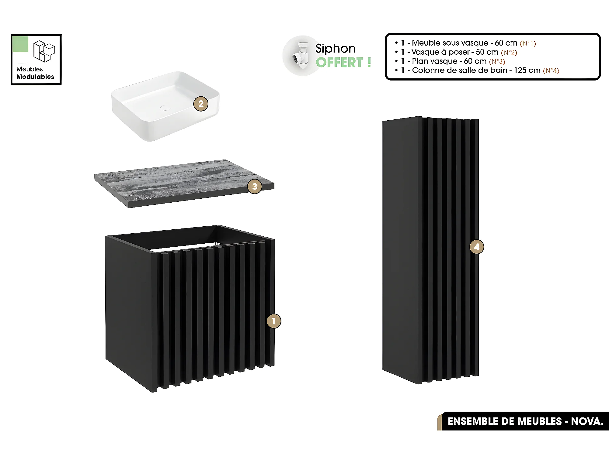 Ensemble complet de salle de bain - Meuble - Colonne - Vasque à poser avec Siphon OFFERT | NOVA | Noir | 60 x 56 x 45 cm