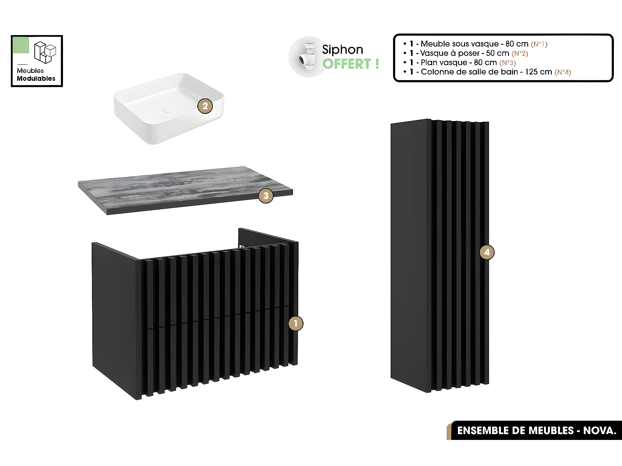 Ensemble complet de salle de bain - Meuble - Colonne - Vasque à poser avec Siphon OFFERT | NOVA | Noir | 80 x 56 x 45 cm