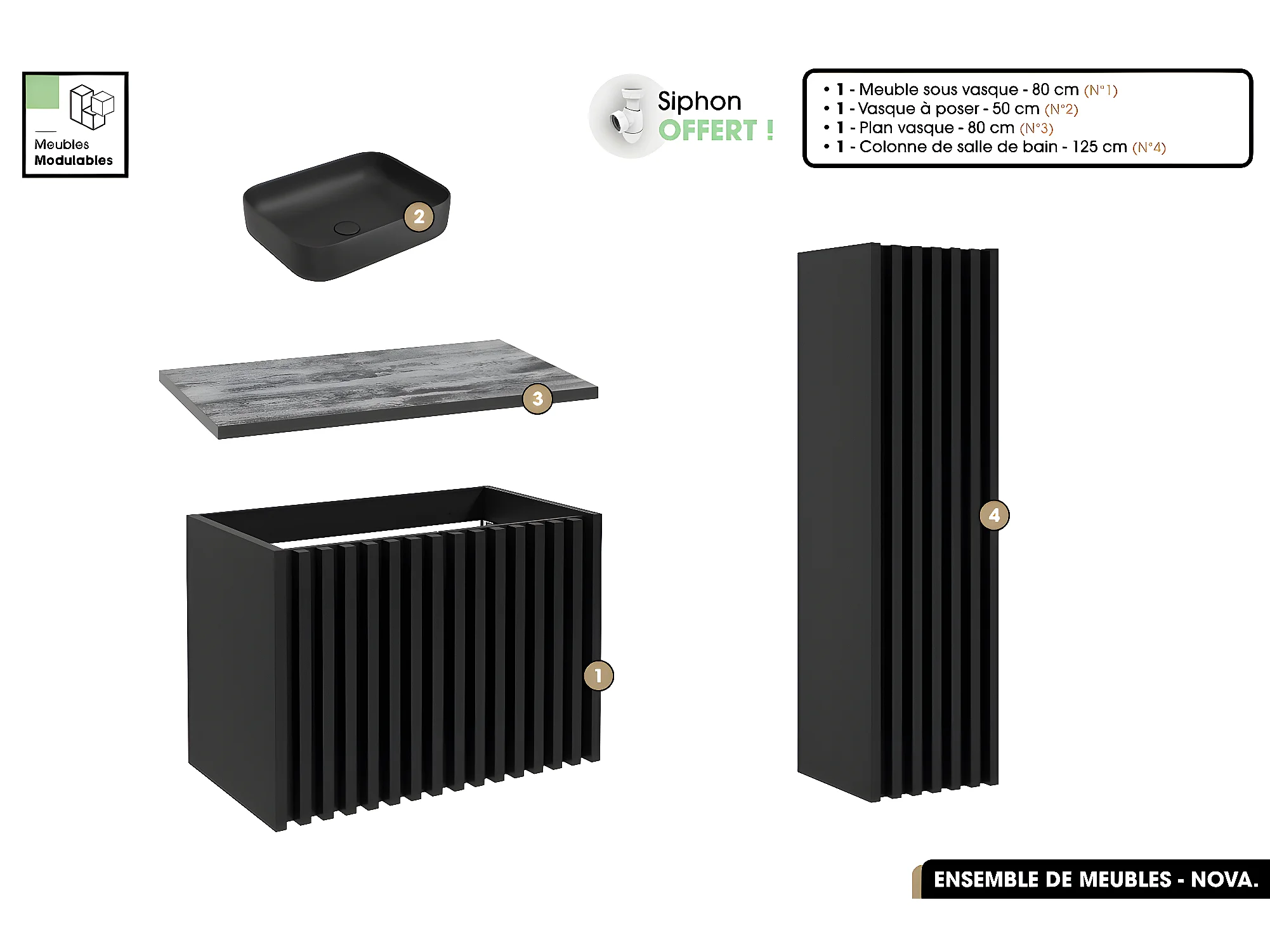 Ensemble complet de salle de bain - Meuble - Colonne - Vasque à poser avec Siphon OFFERT | NOVA | Noir | 80 x 56 x 45 cm