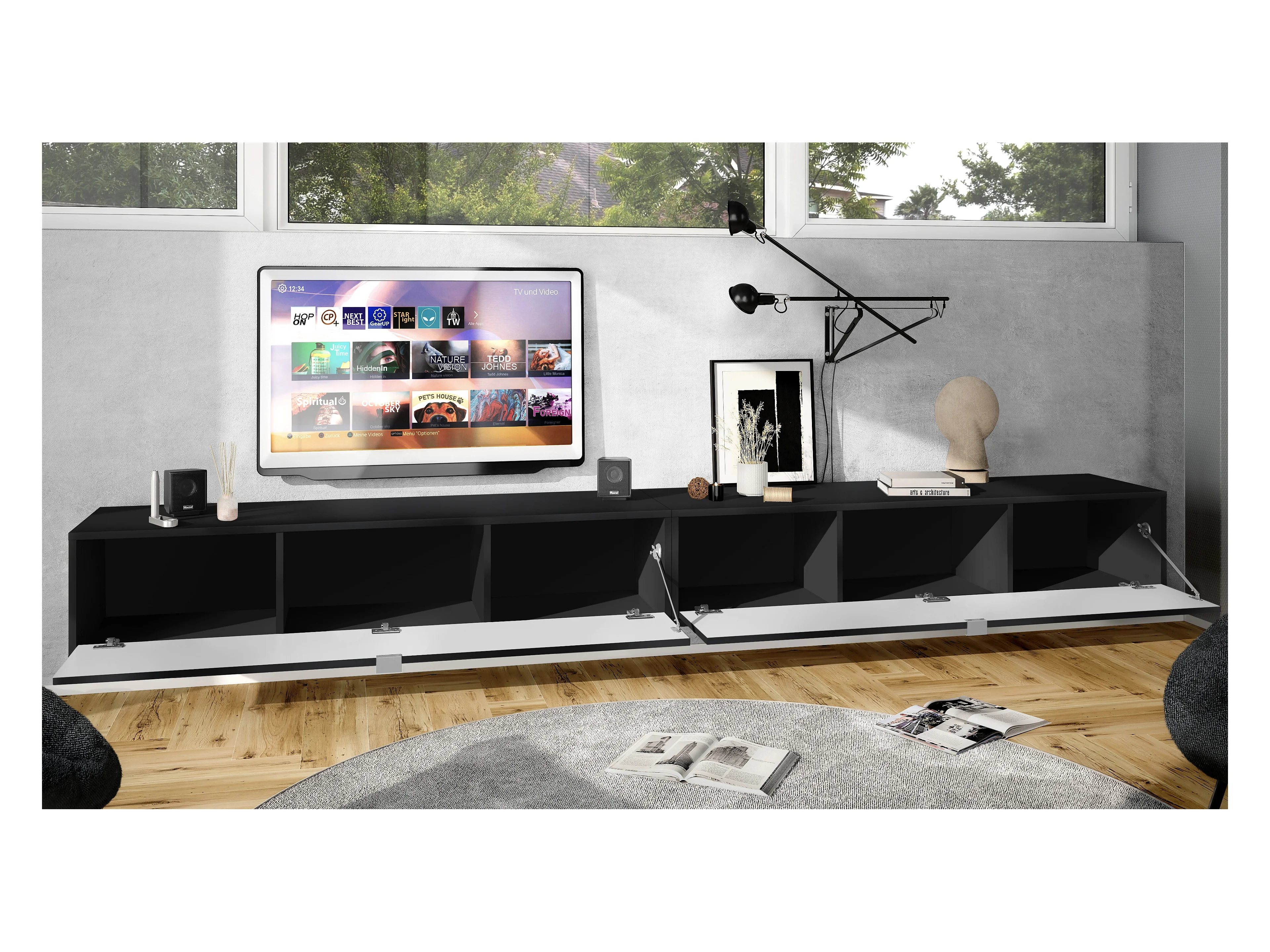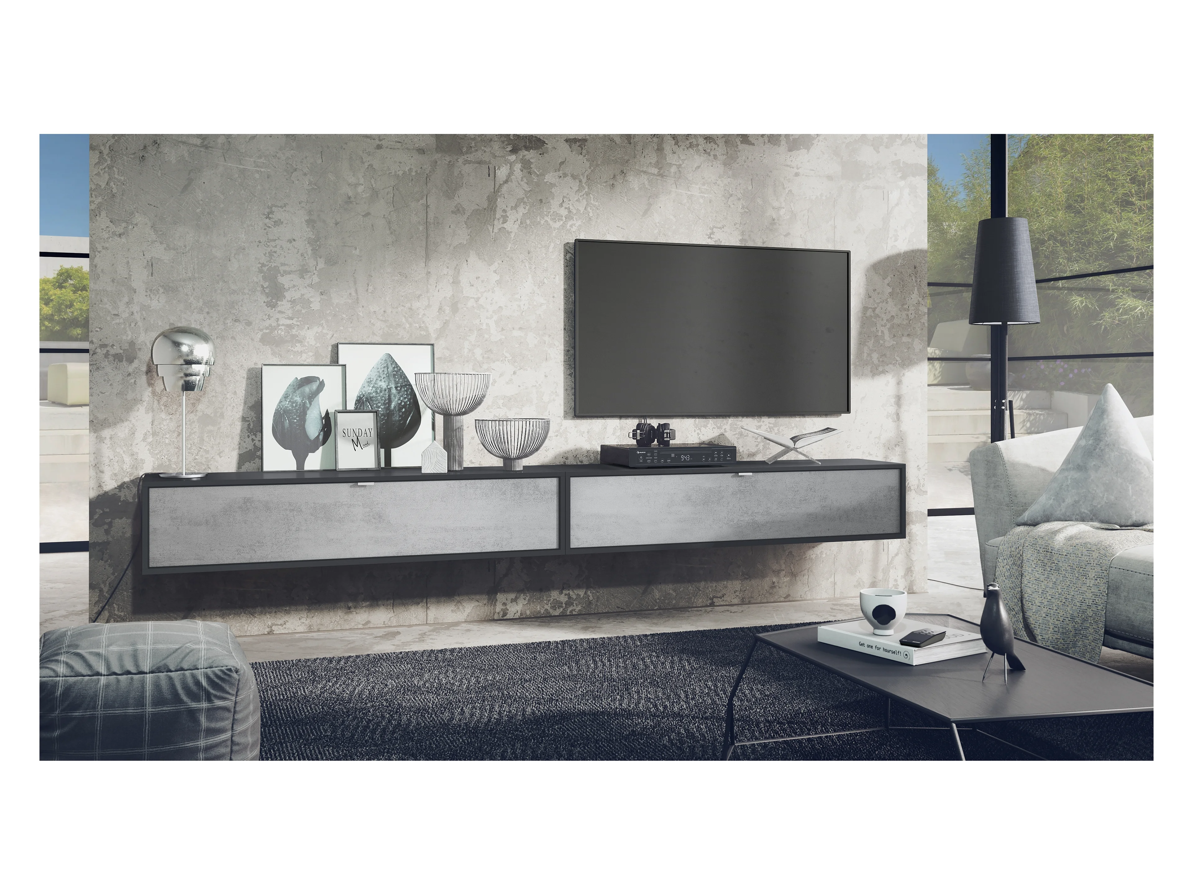 Ensemble de 2 set meuble TV Lana 140, lowboards de 140x29x37 cm chacun avec beaucoup d'espace de rangement, caisson en Noir mat, façades en Aspect Béton Oxyde
