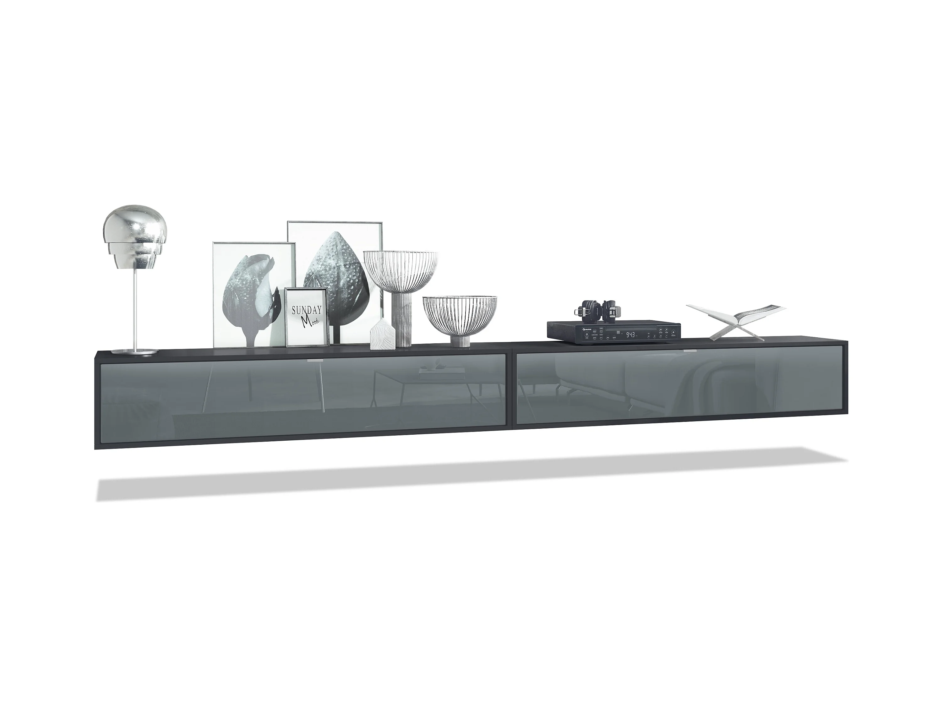 Ensemble de 2 set meuble TV Lana 140, lowboards de 140x29x37 cm chacun avec beaucoup d'espace de rangement, caisson en Noir mat, façades en Gris brillant