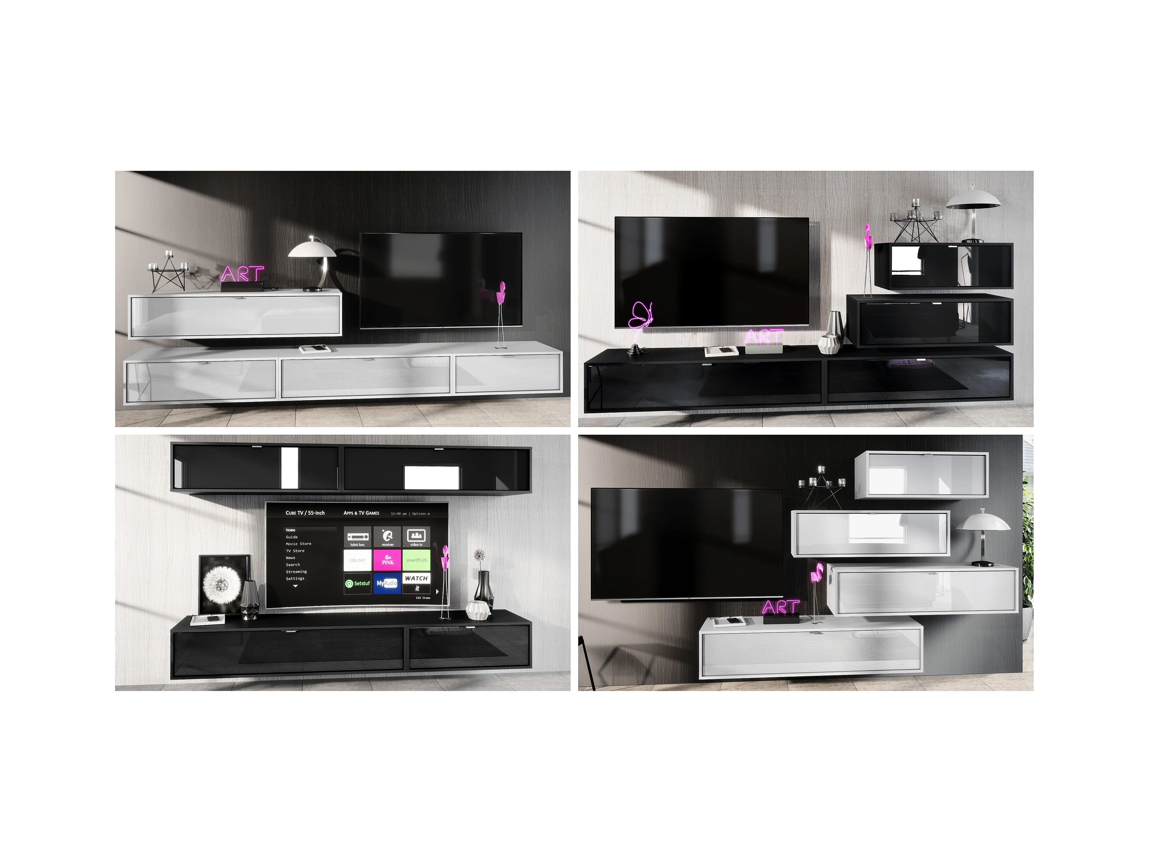 Ensemble de 2 Set Meuble TV Lana 140, lowboards de 140x29x37 cm chacun avec Beaucoup d'espace de Rangement en Noir Mat, façades en Gris Sable brillant…