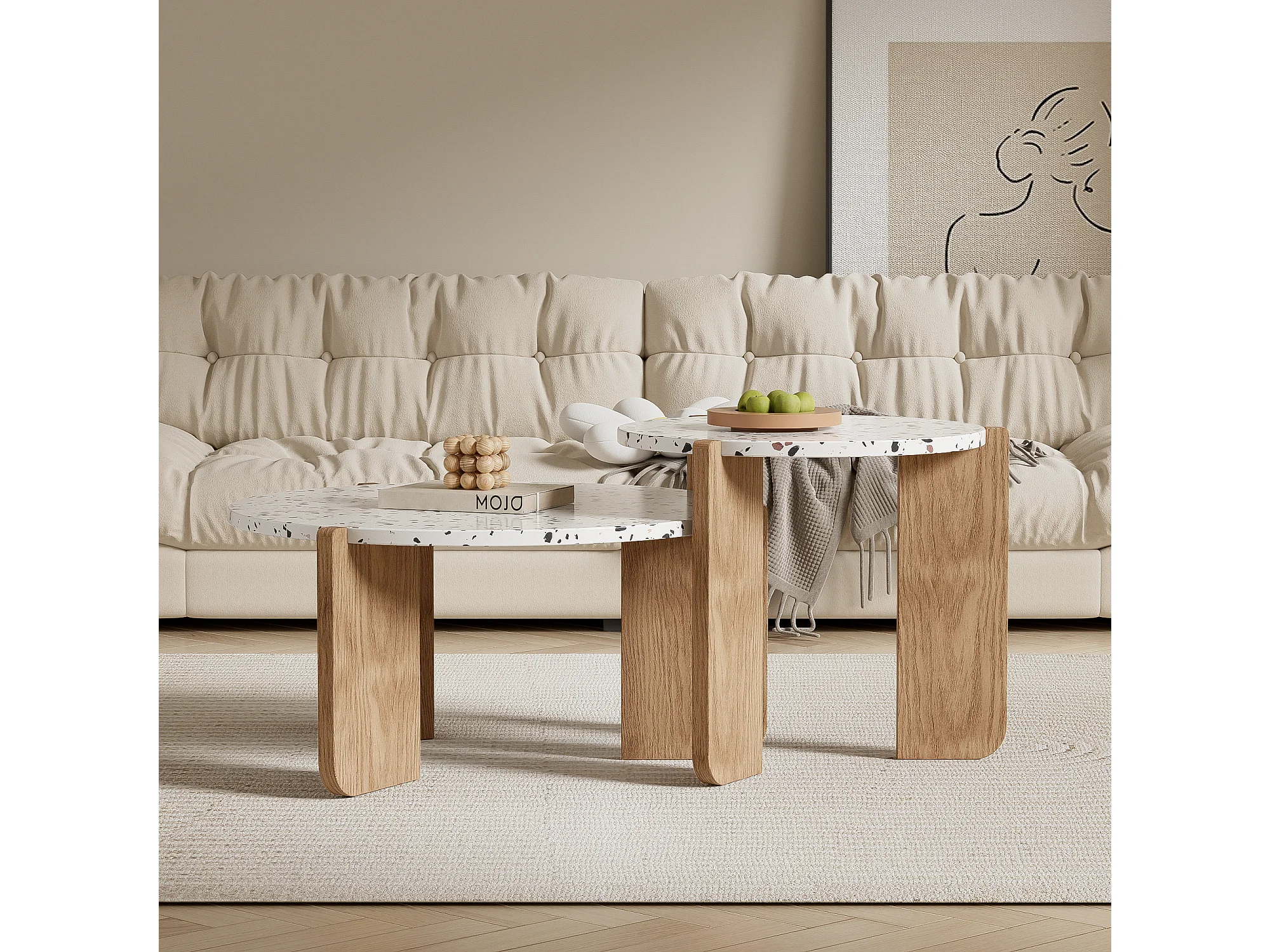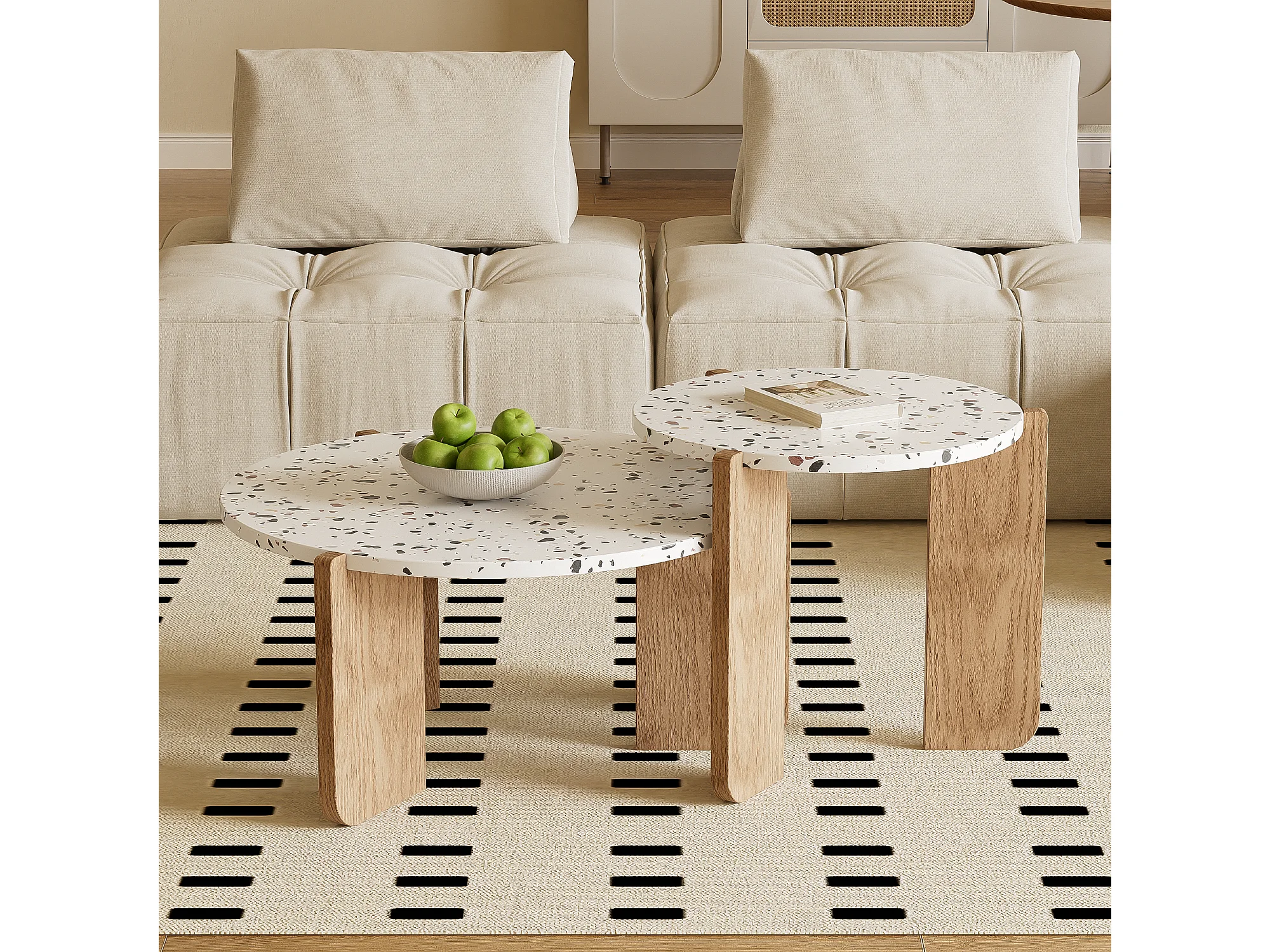 URBAN MEUBLE Ensemble de 2 tables basses gigognes blanches rondes pieds bois