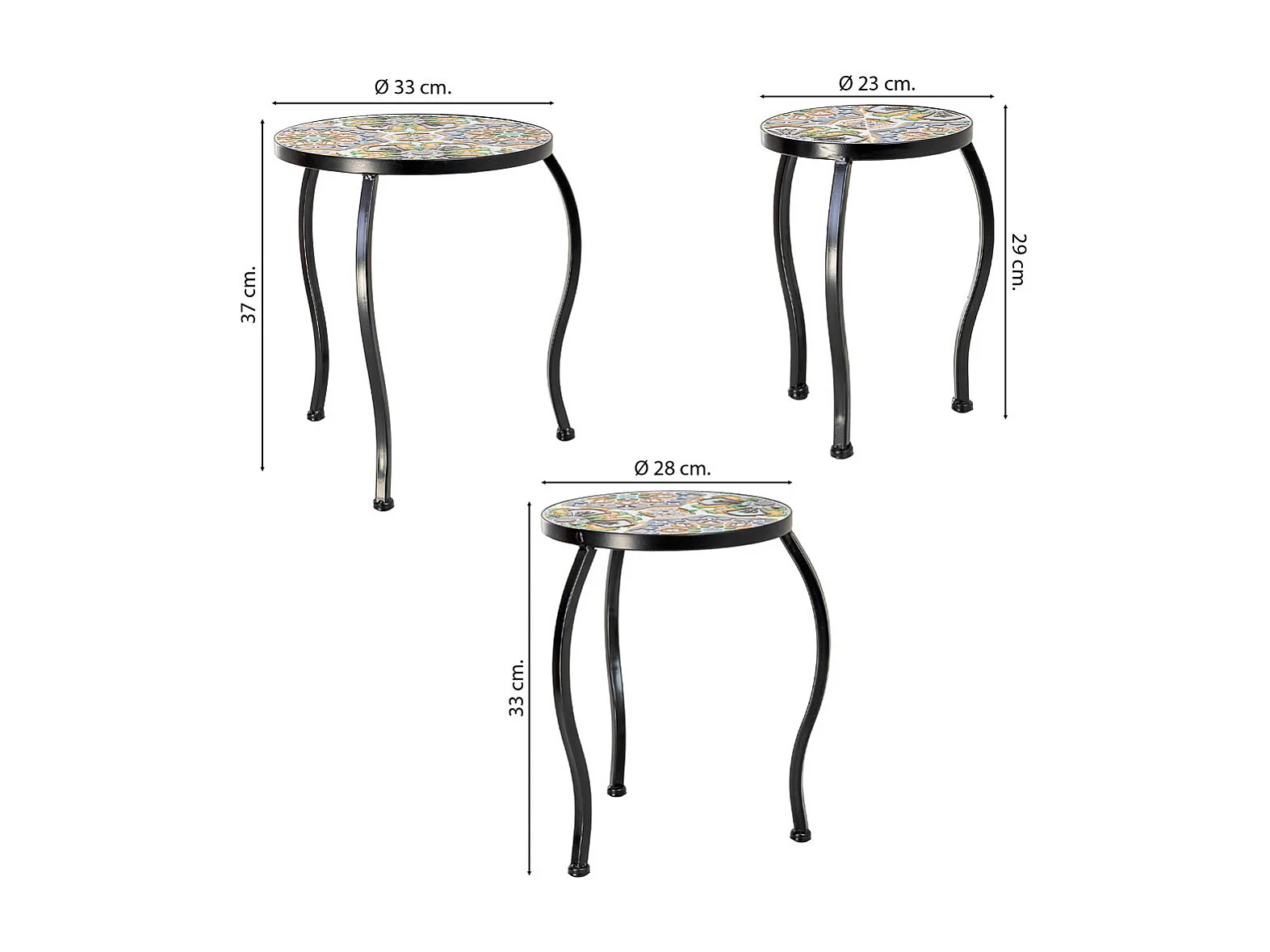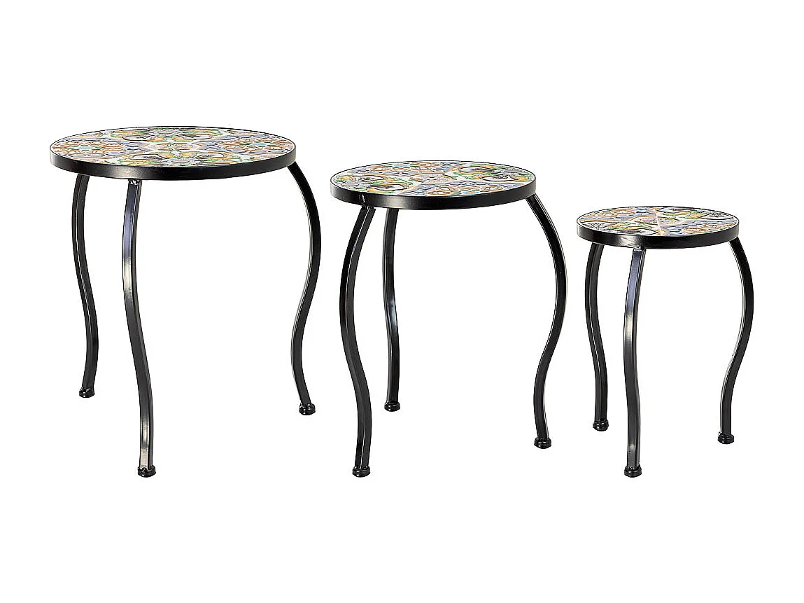 Ensemble de 3 supports en mosaïque et fer forgé, noir, 33 x 33 x 37 cm - 28 x 28 x 33 cm - 23 x 23 x 29 cm