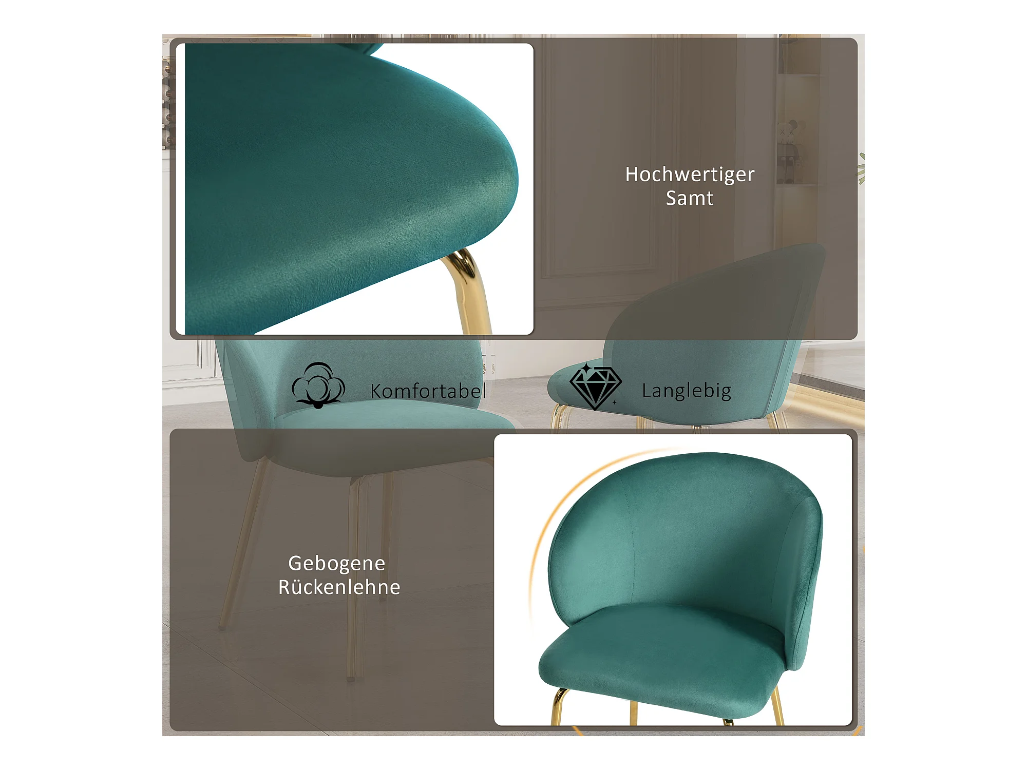 Ensemble de 6 chaises de salle à manger modernes avec revêtement en velours, accoudoirs, pieds en métal doré, vert