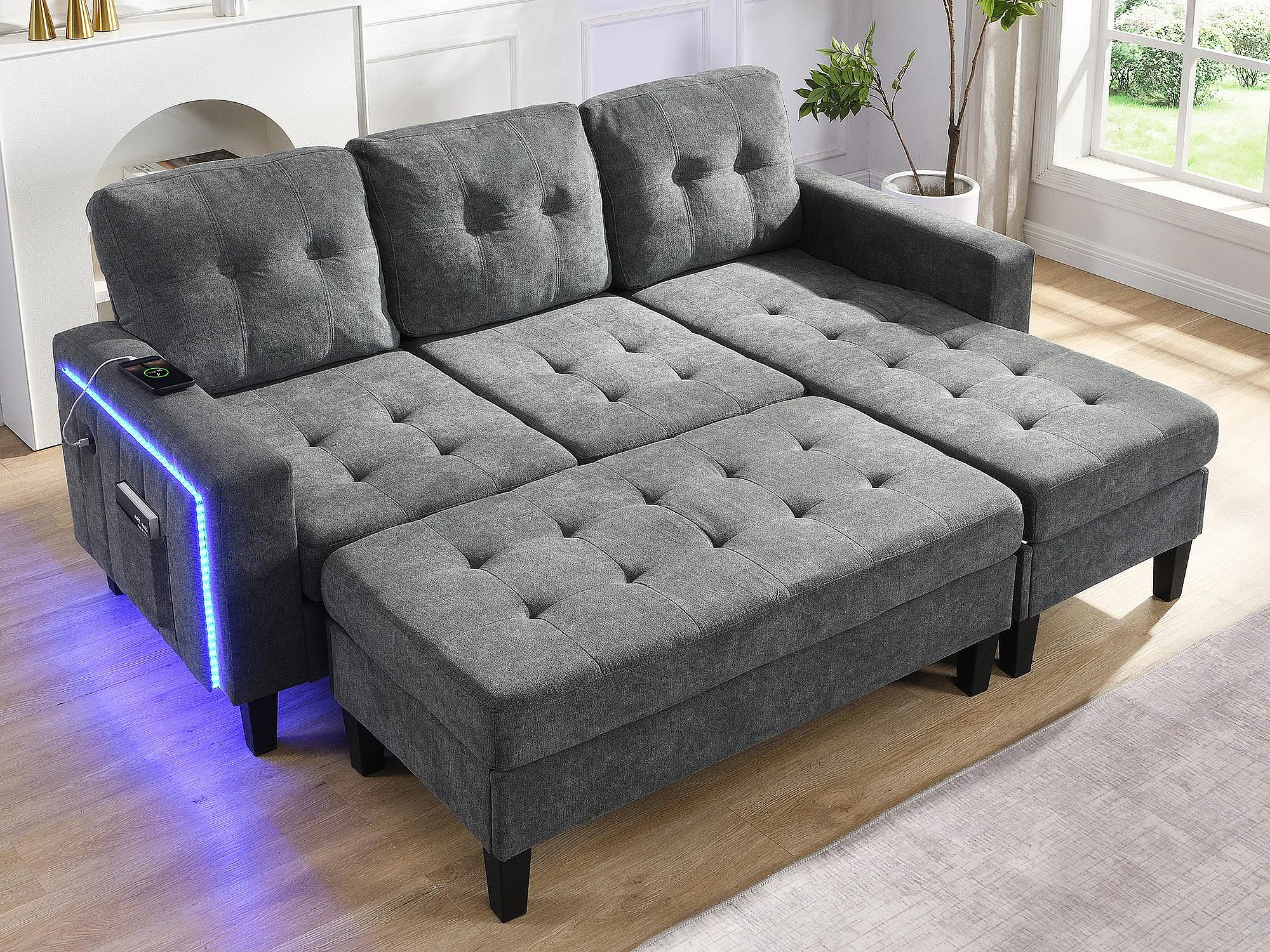 Ensemble de canapé en L 185x135x85cm - avec repose-pieds amovible et éclairage LED - avec USB - combinaison libre - Gris