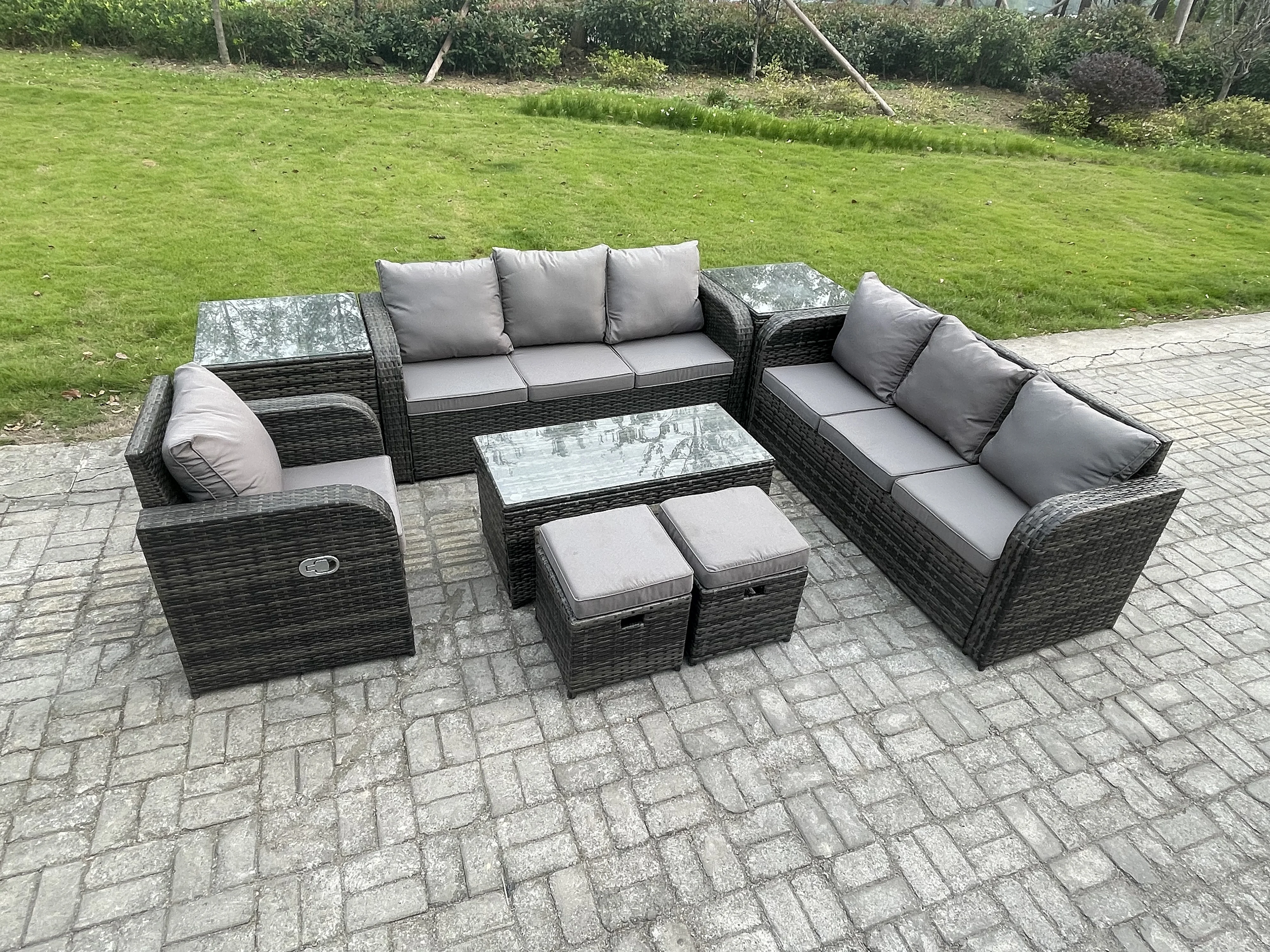 Ensemble de canapés en rotin 9 places Salon de jardin avec Table basse rectangulaire 2 Petits tabourets Canapé 3 places 2 Tables d'appoint Gris foncé mixte