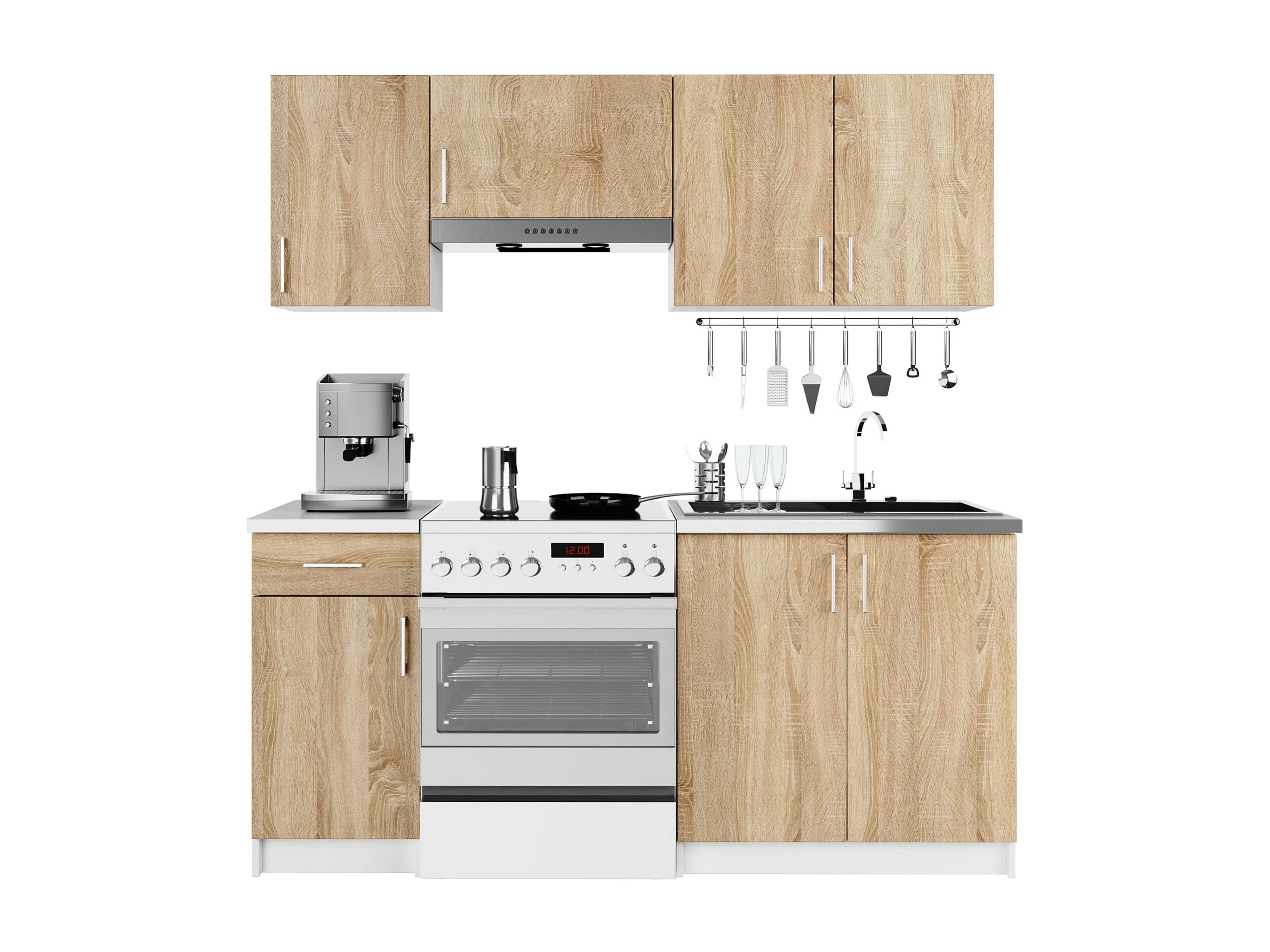 Ensemble De Cuisine AKORD LIMA 1.8m Blanc 180 cm 7 portes 1 tiroir façade Chêne Sonoma 8 étagères 180x44,5x203 cm