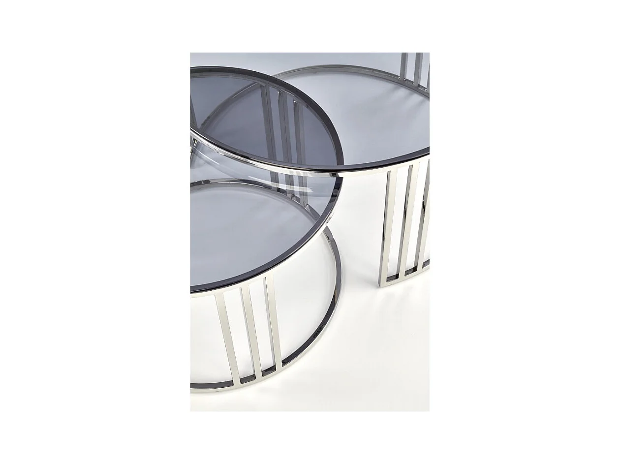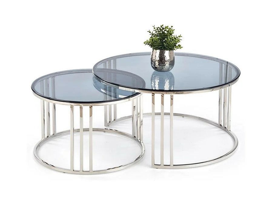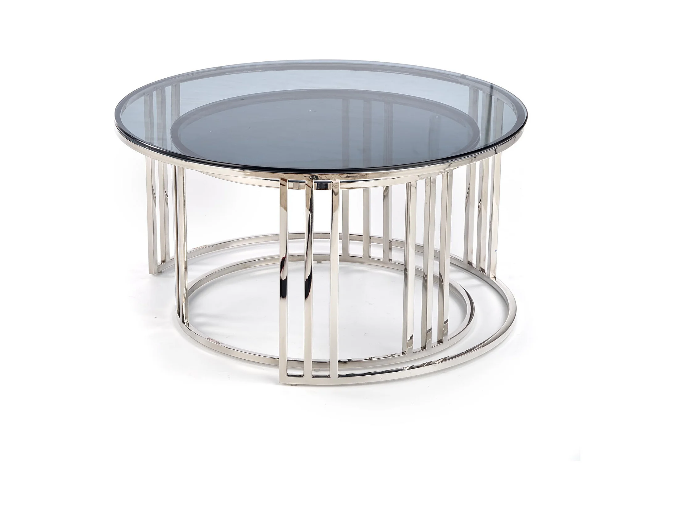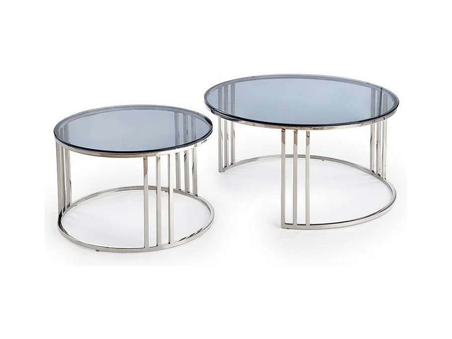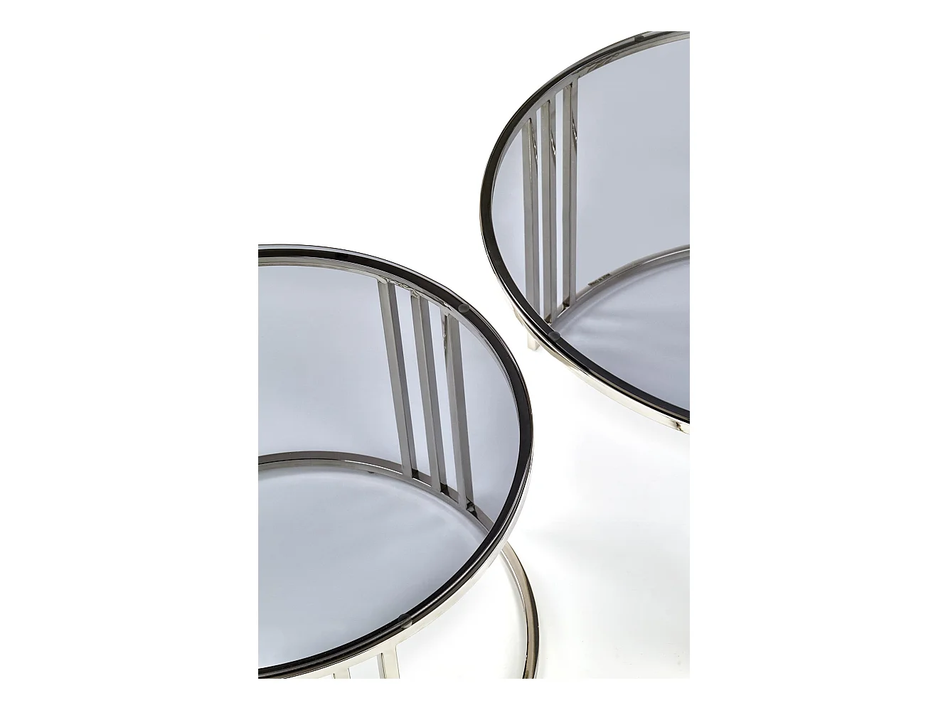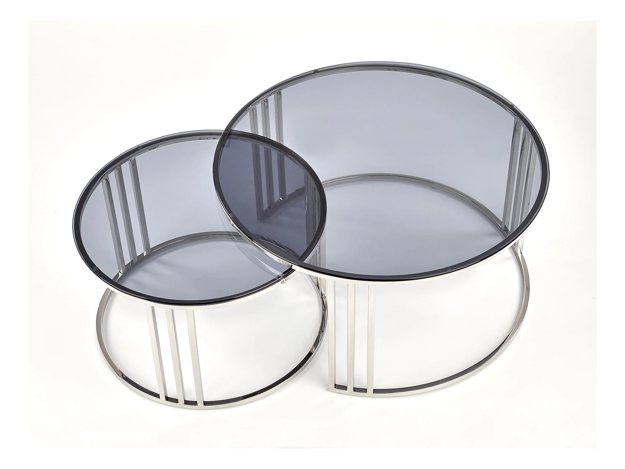Ensemble de deux tables basses gigognes rondes avec plateaux en verre fumé et structure en acier chromé Salma