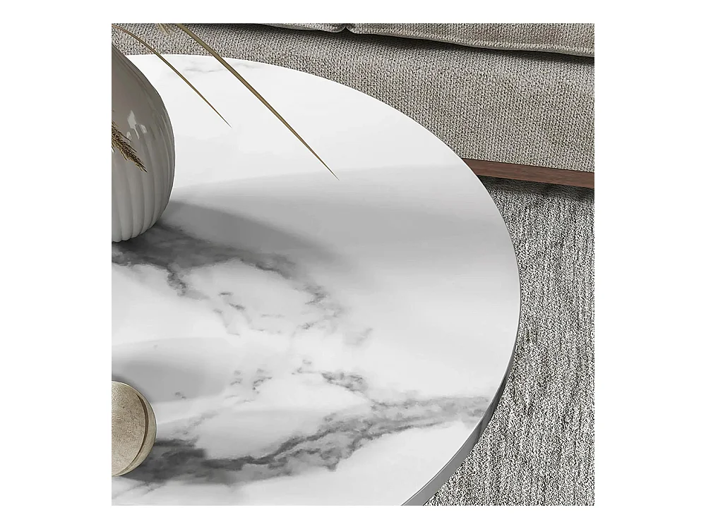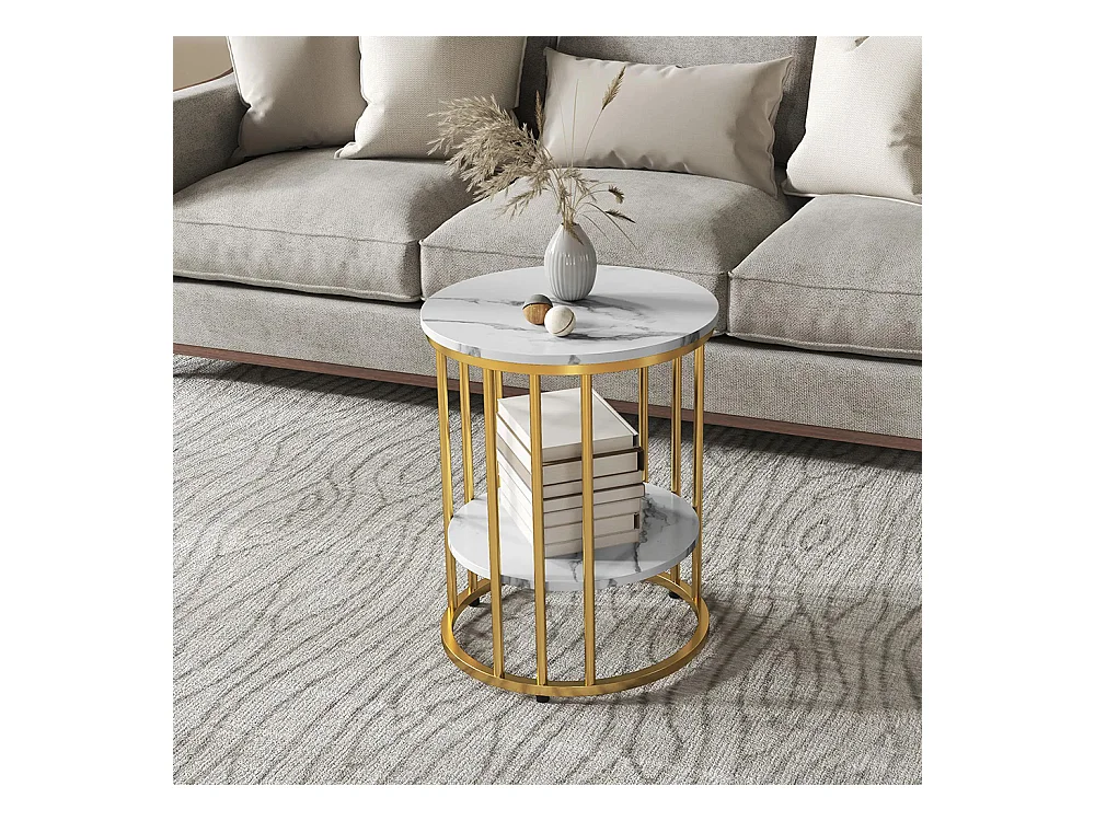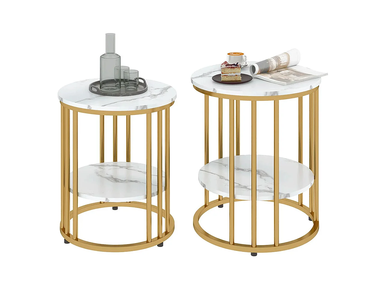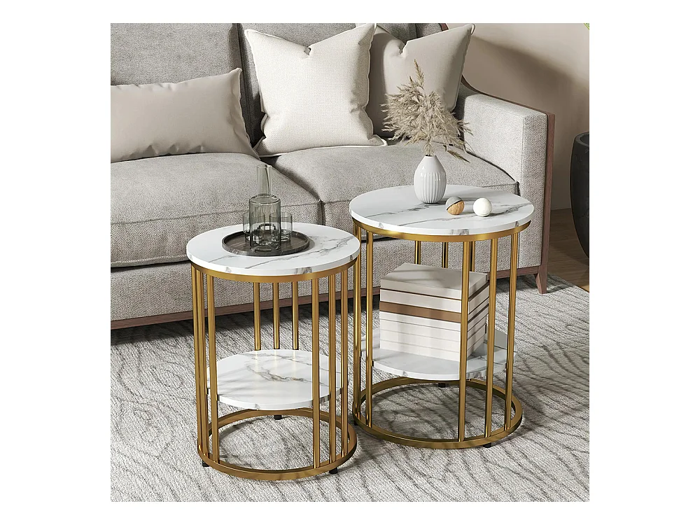 Lot de 2 Tables Basses gigognes - Tables d'appoint Rondes encastrables Style néo-rétro Bicolore Structure métal doré Plateau MDF Aspect marbre Blanc