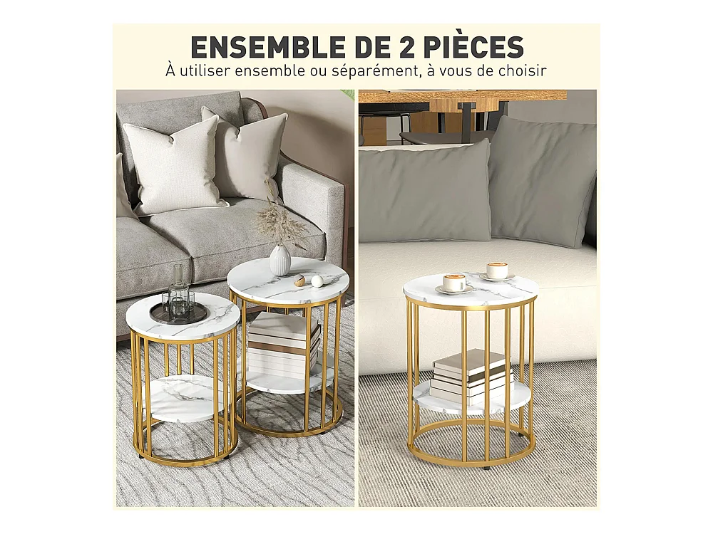 Lot de 2 tables basses tables d'appoint gigognes encastrables structure en acier et plateau en bois aspect marbre or