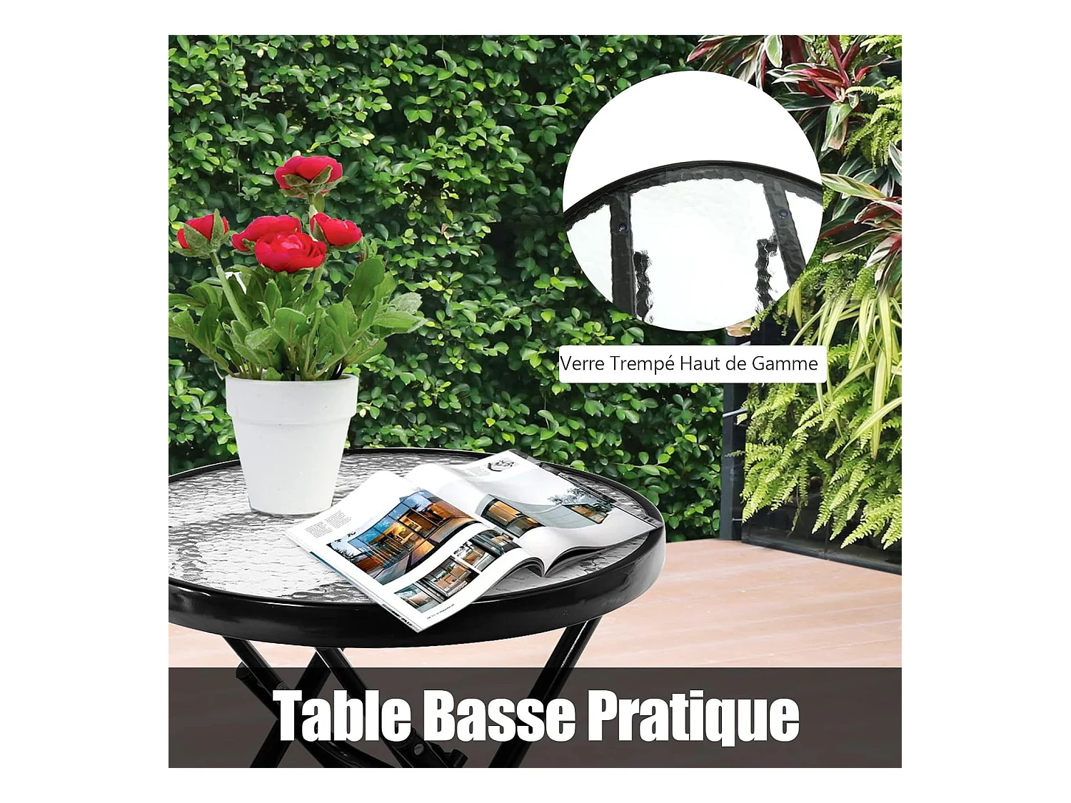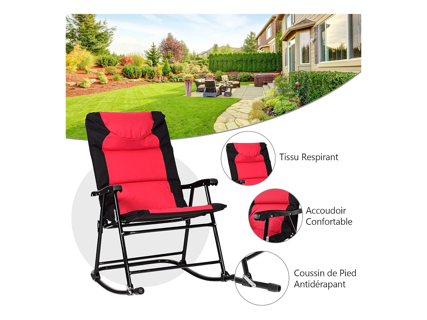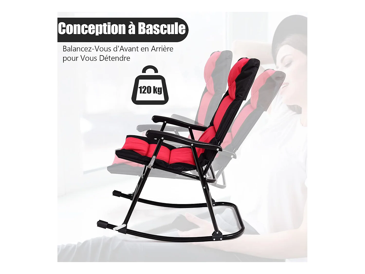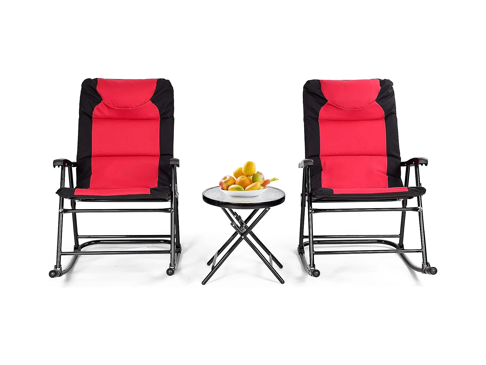 Ensemble de Jardin 3 PCS Table Basse en Verre avec 2 Chaises Extérieures à Bascule Pliables Coussins Rembourrés, Rouge