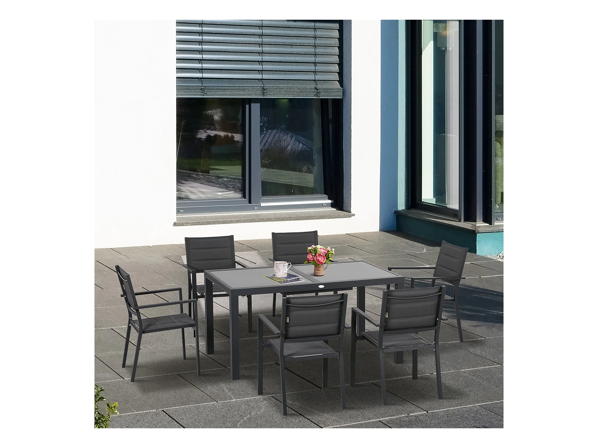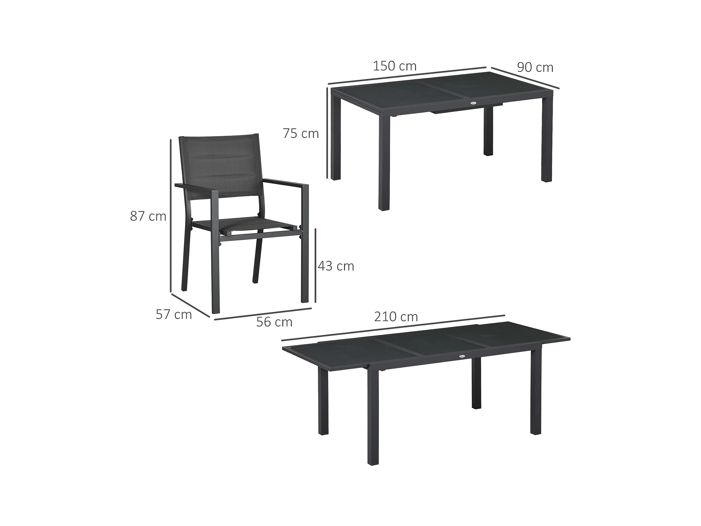 Ensemble de jardin 6 personnes chaises empilables table extensible 150/210L cm alu. teslin gris
