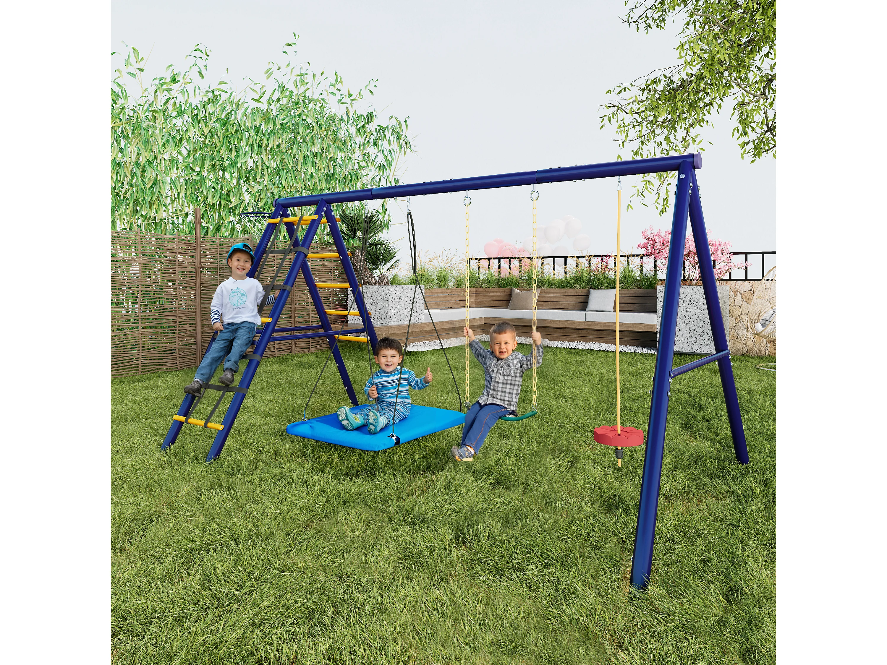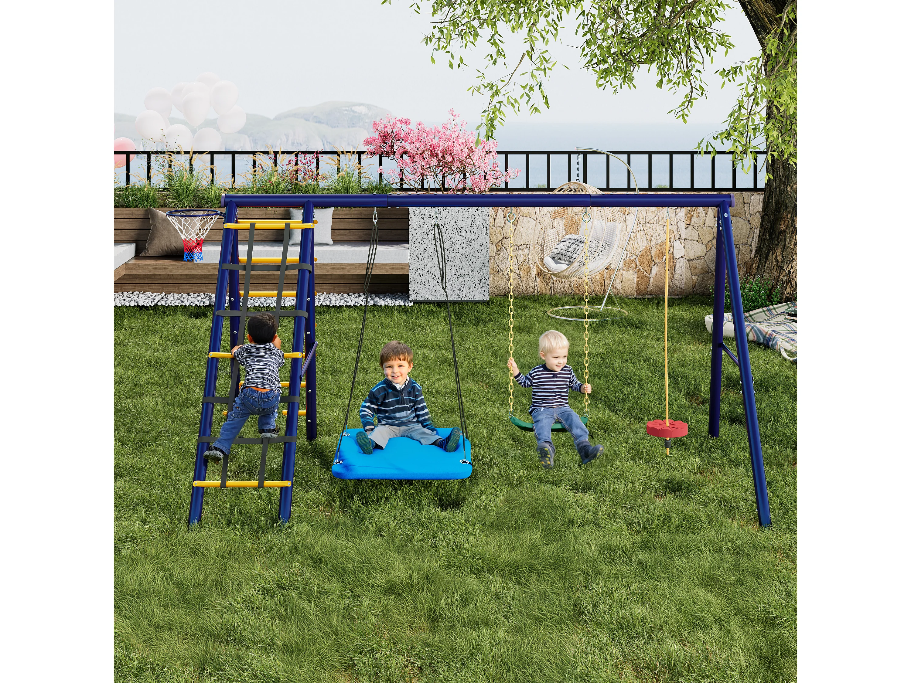 Ensemble de jeux extérieur multifonctionnel pour enfants – 3 balançoires, toboggan, panier de basket, structure d'escalade, balançoire suspendue et cordes