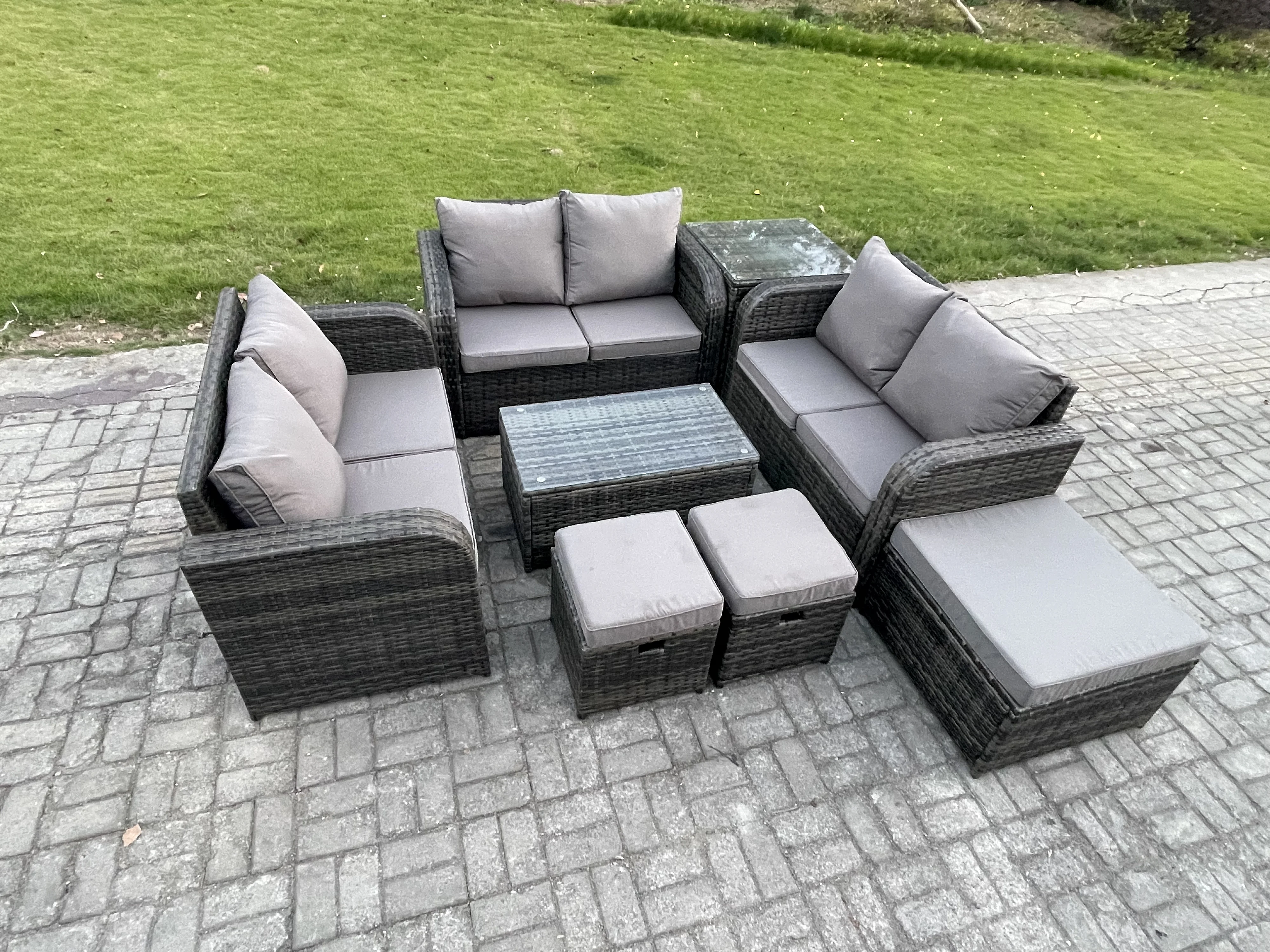 Ensemble de meubles de jardin en polyrotin 9 places avec Table basse rectangulaire Canapé d'amour 3 Tabourets Table d'appoint Gris foncé mixte