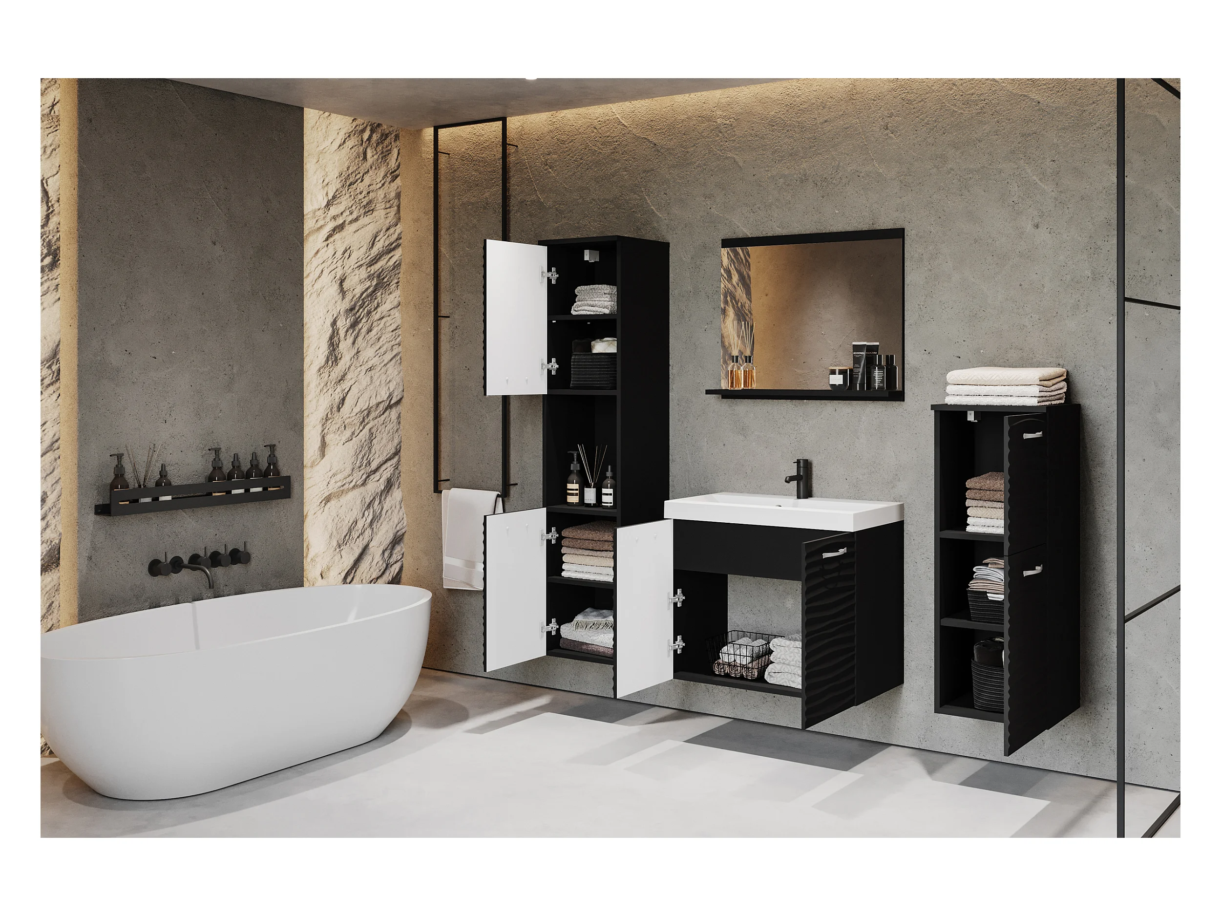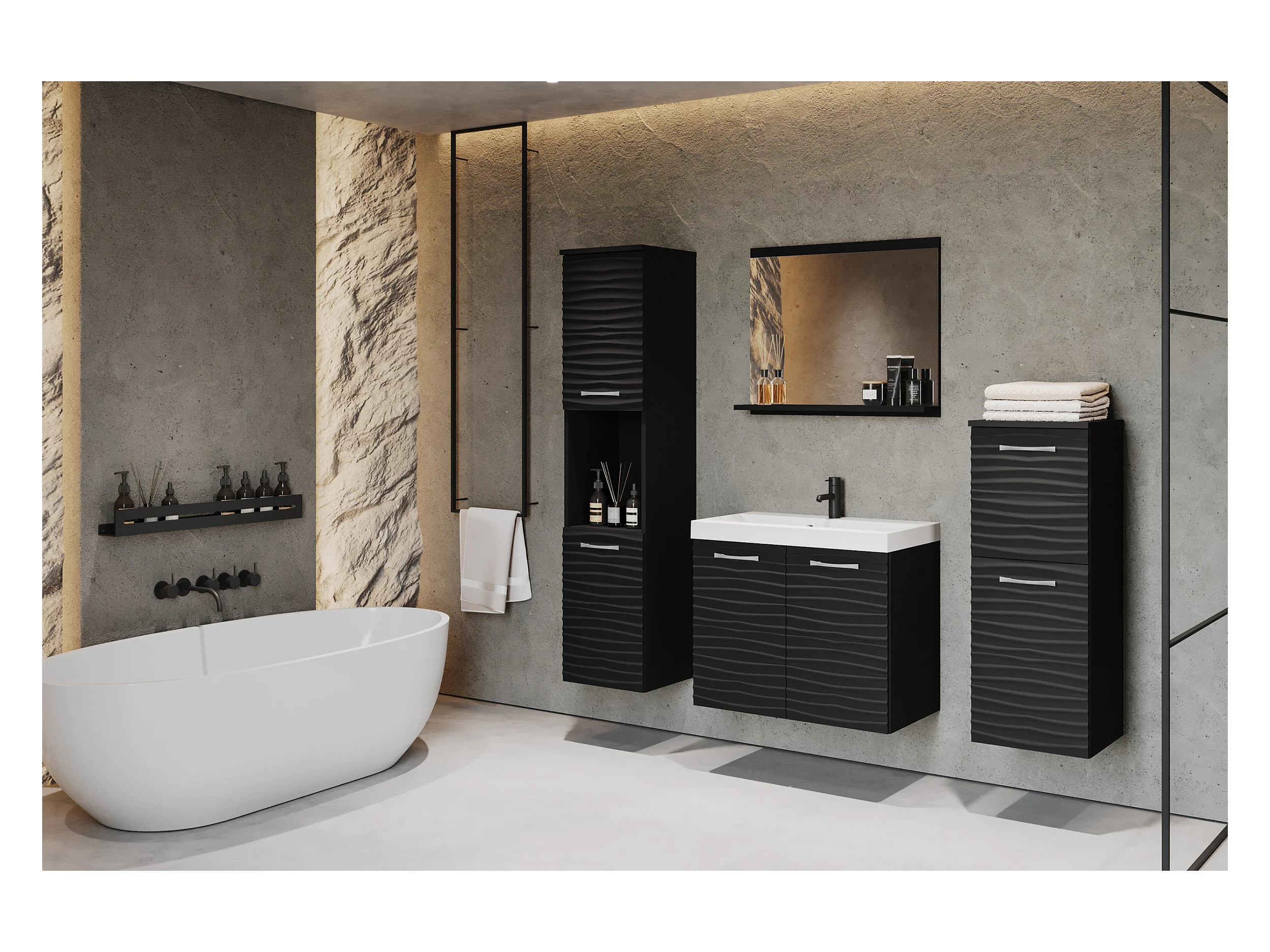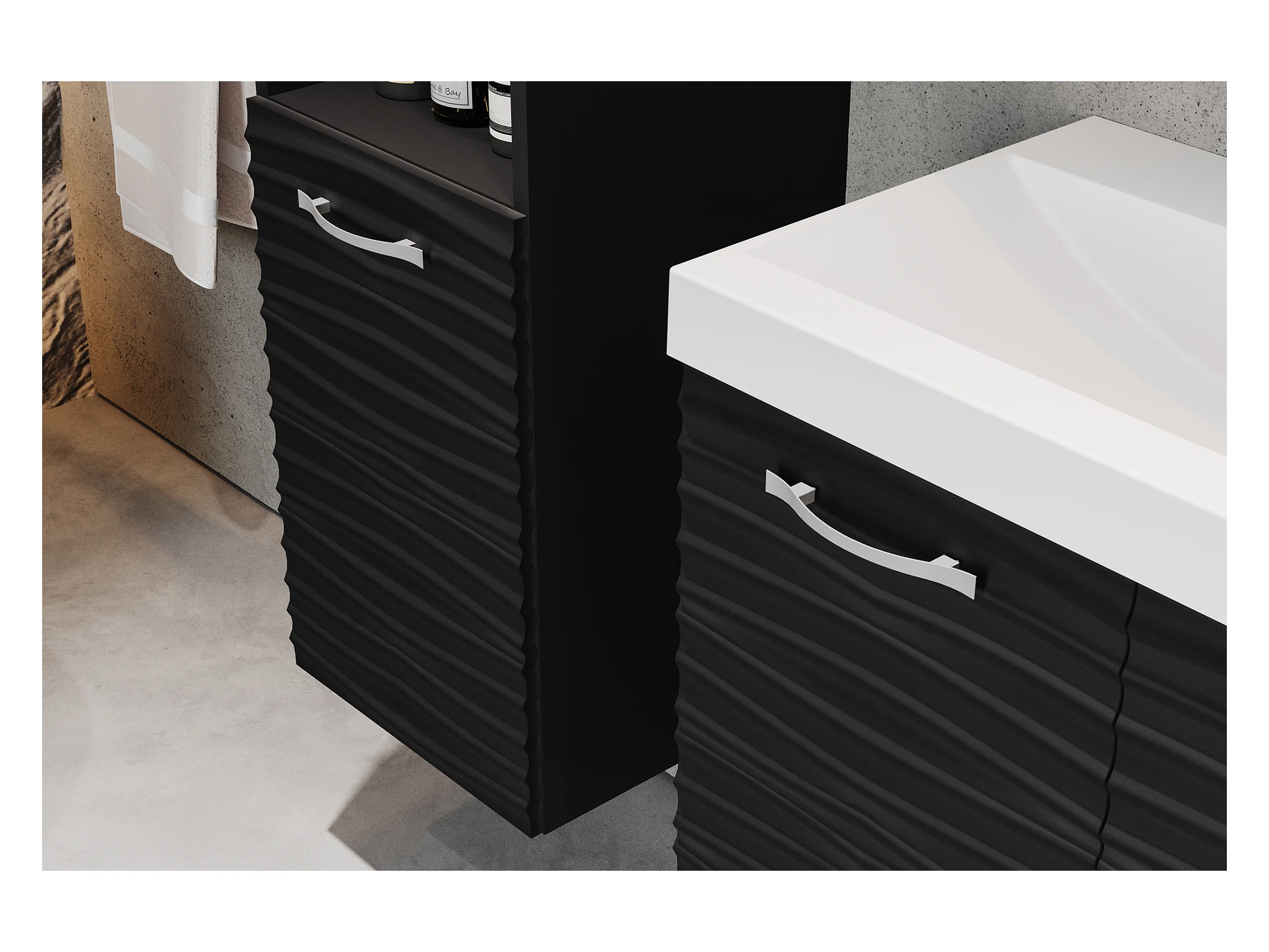 Ensemble de meubles de salle de bain - noir / noir graphite avec façade ondulée - GRIPTICIALS