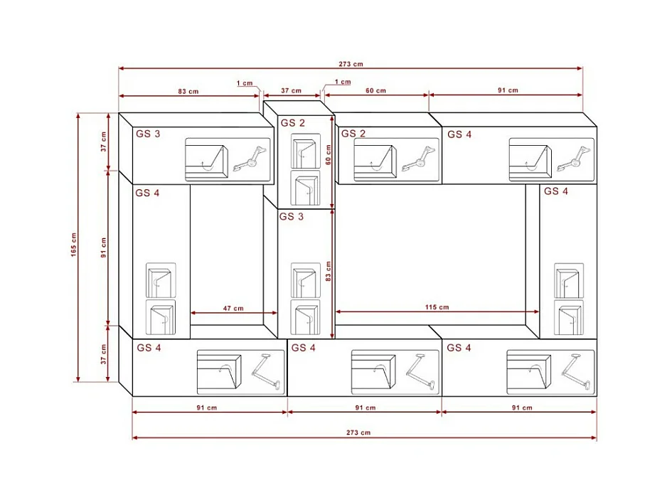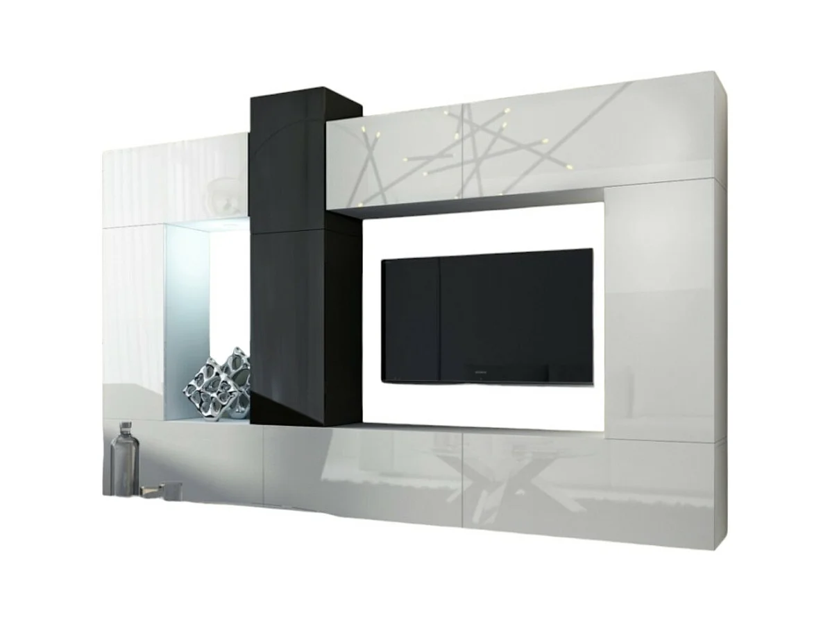 Ensemble de meubles de salon blanc et noir suspendus collection CEPTO XXII. 273cm, 10 meubles, leds, modulables.