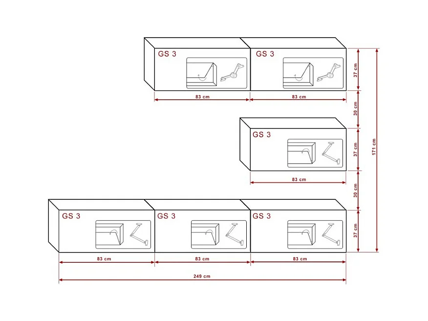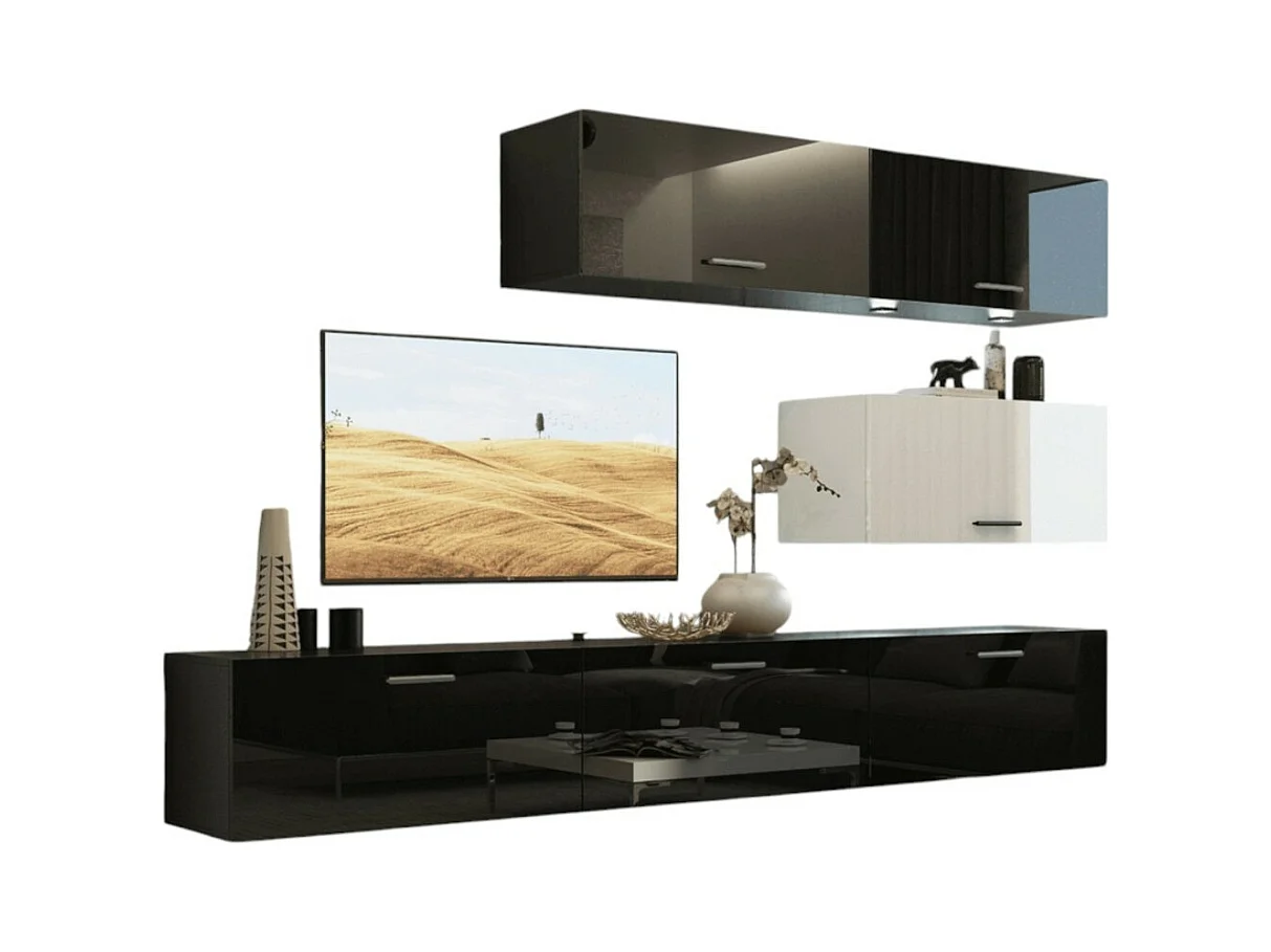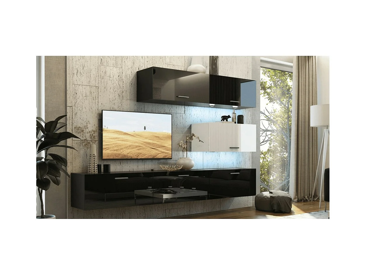 Ensemble de meubles de salon noir et blanc, suspendus collection CEPTO XXV. 249cm, 6 meubles, leds, modulables.