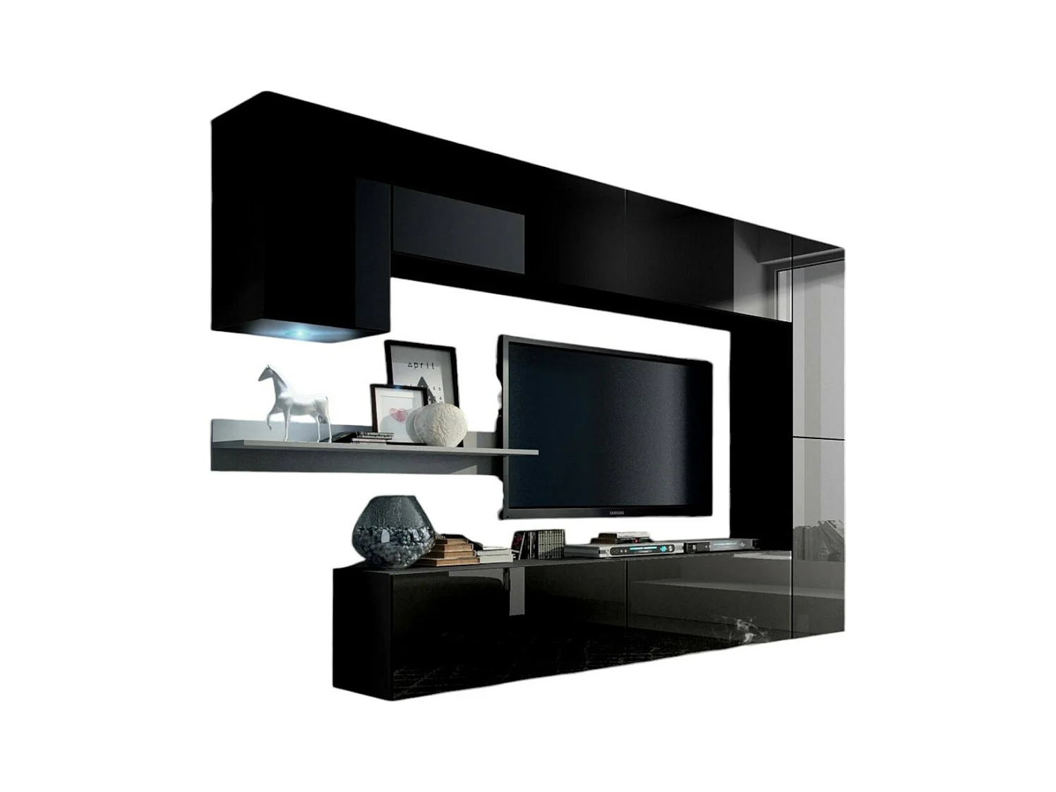 Ensemble de meubles de salon noir suspendus collection CEPTO VI 256cm, 7 portes, étagère murale blanche, leds, modulables.