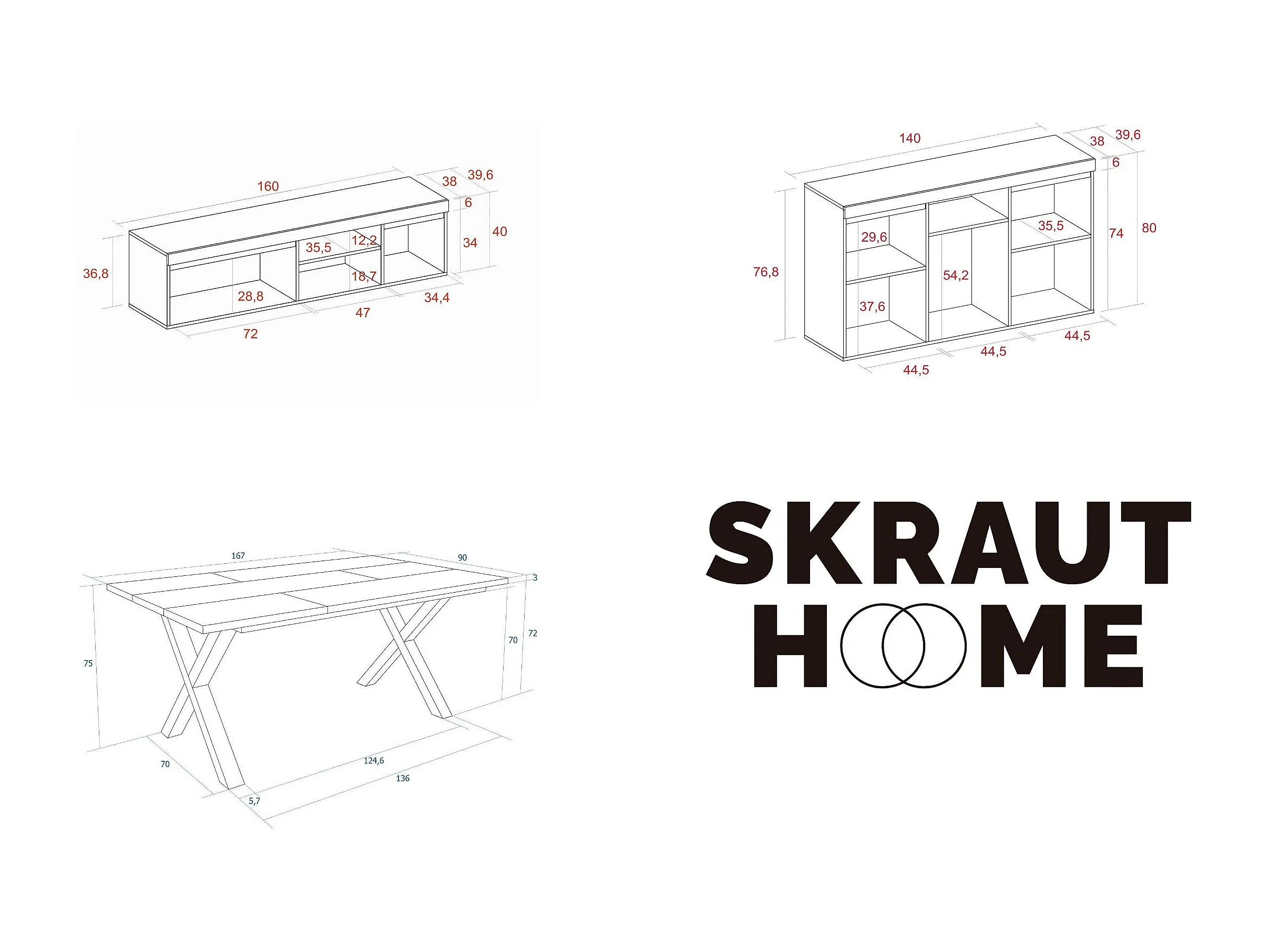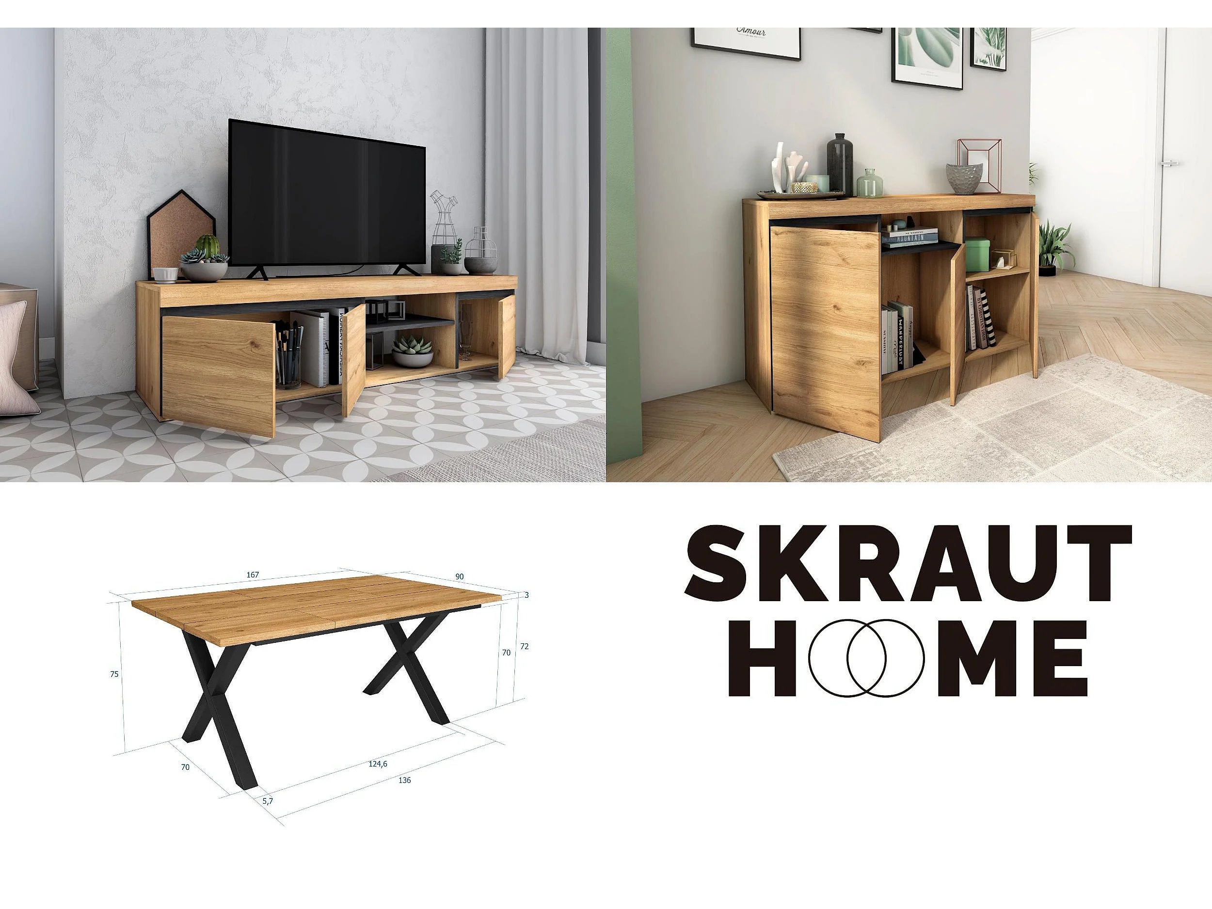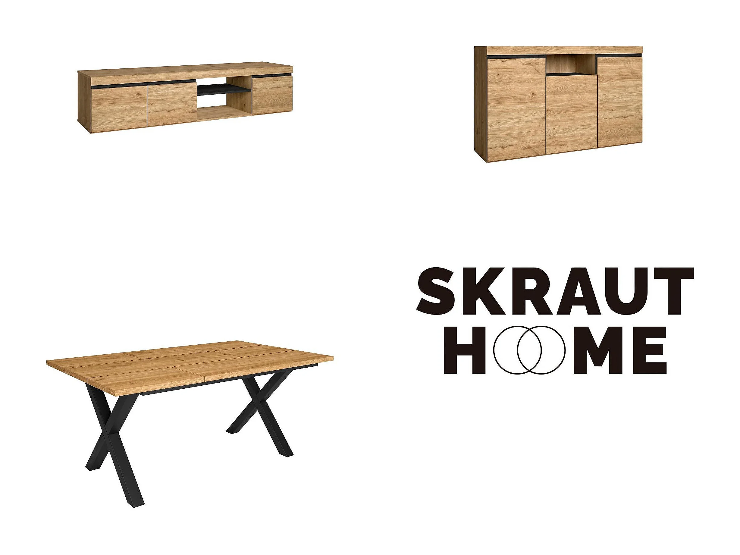 Ensemble de meubles de salon, Table 170 pieds U 8 convives, Meuble TV 160, Crédence / Buffet 140, Chêne et Noir, Style Industriel
