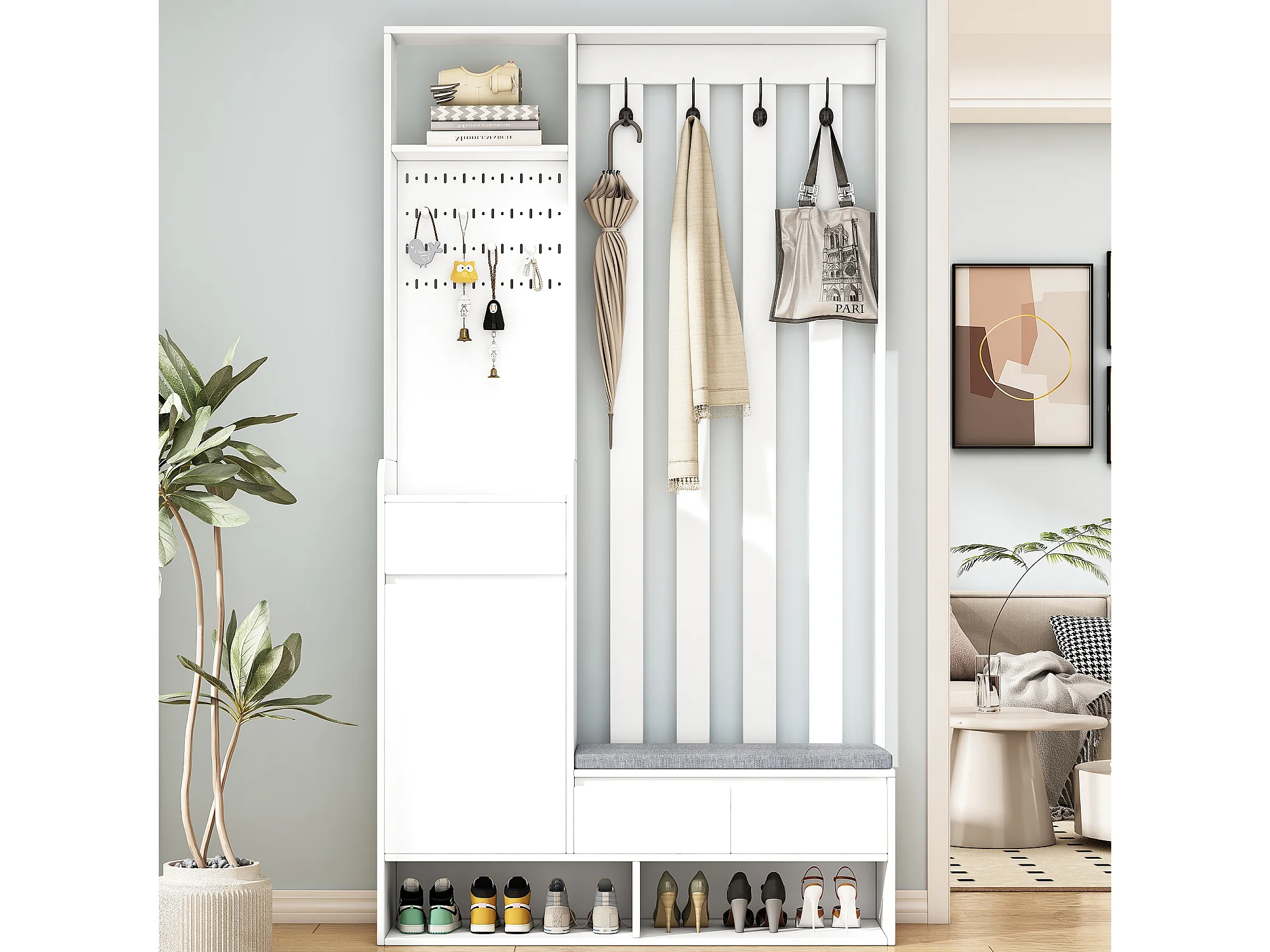 Meuble d'entrée 100x35x180 cm, 6 en 1 avec banc coussiné et panneau perforé, 4 crochets, MDF blanc