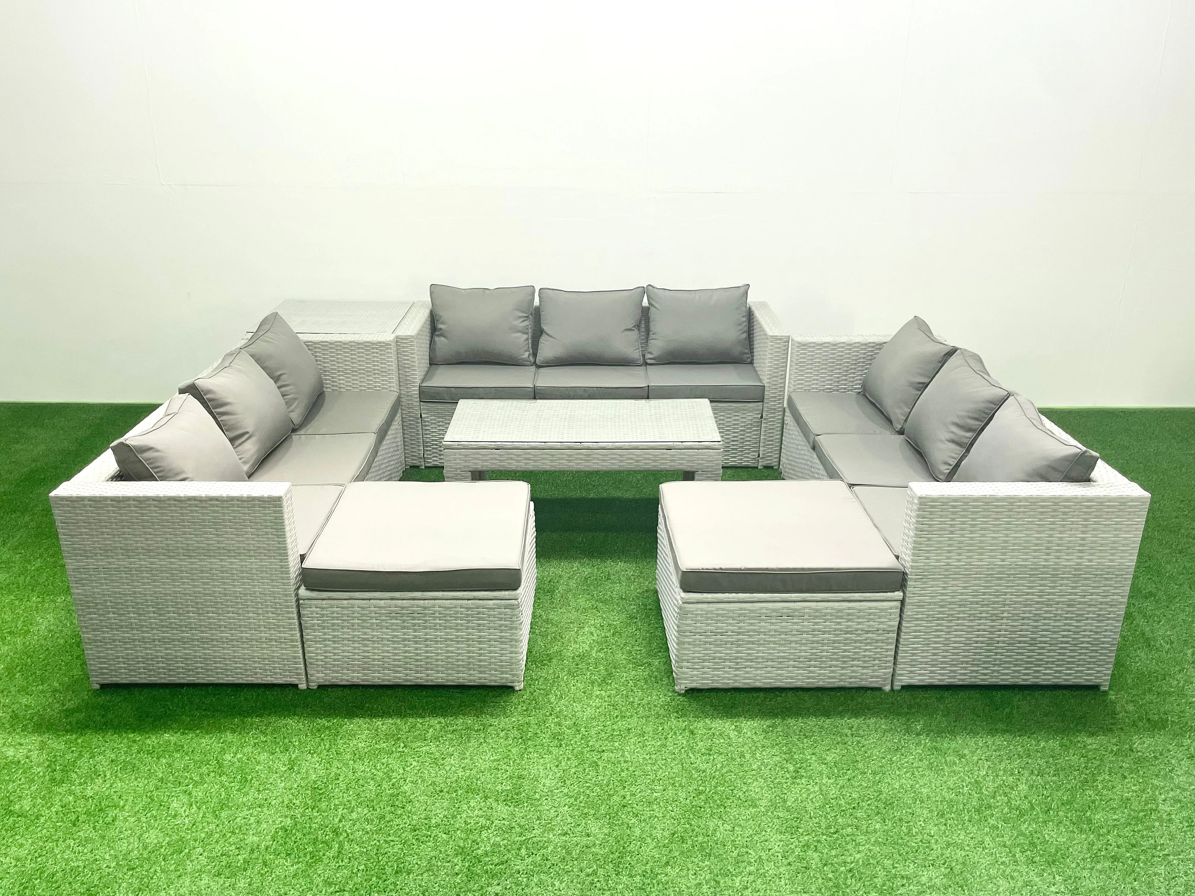 Ensemble de meubles d'extérieur en rotin 11 places avec Table basse oblongue 2 Grand tabourets Table d'appoint Gris clair mixte