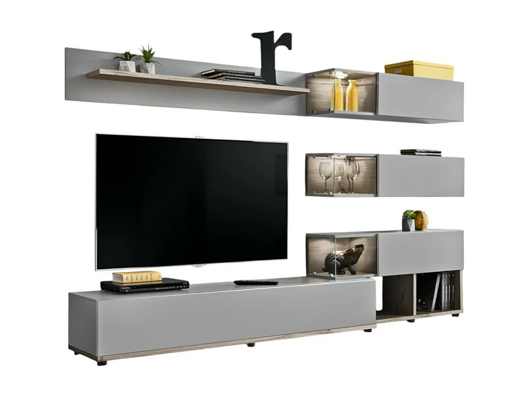 Ensemble de meubles pour votre salon KLIS. Composition murale coloris gris perle et chêne. LED incluses. Meuble tv design