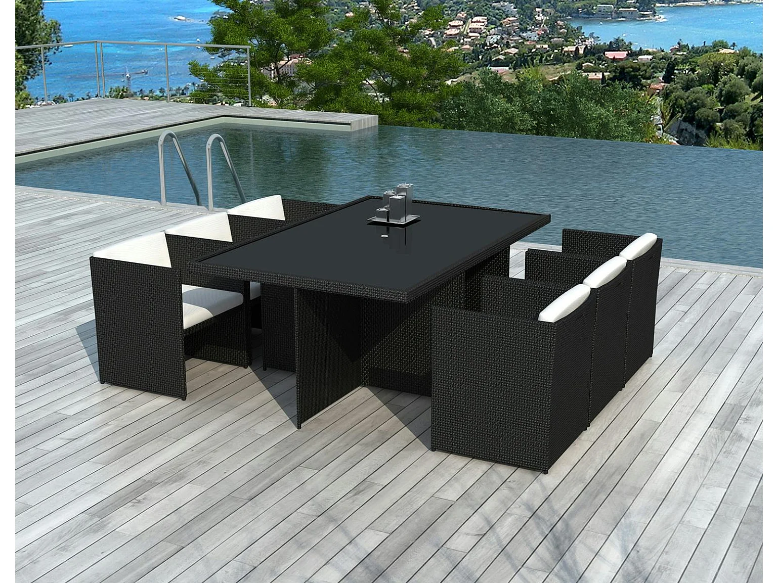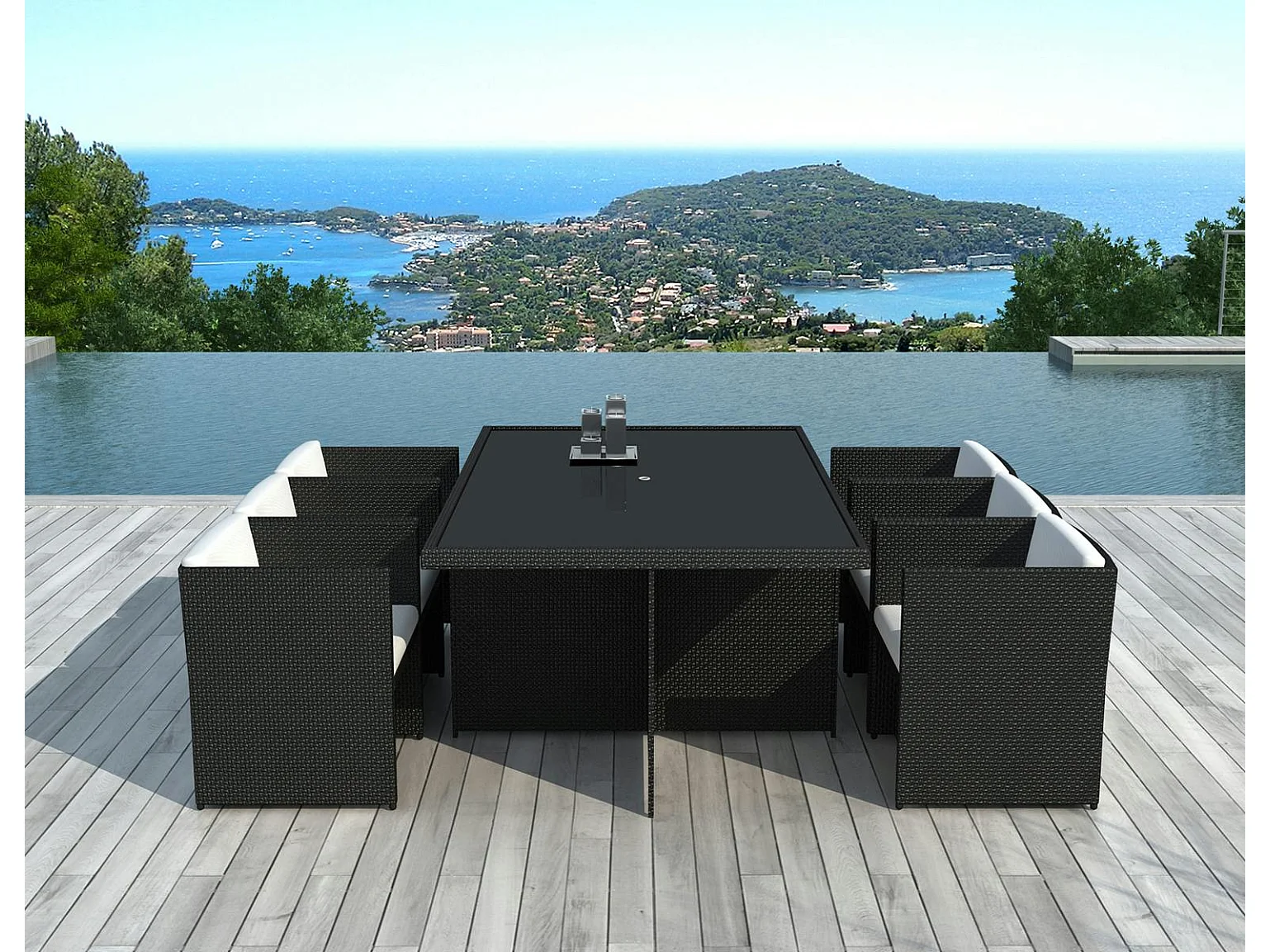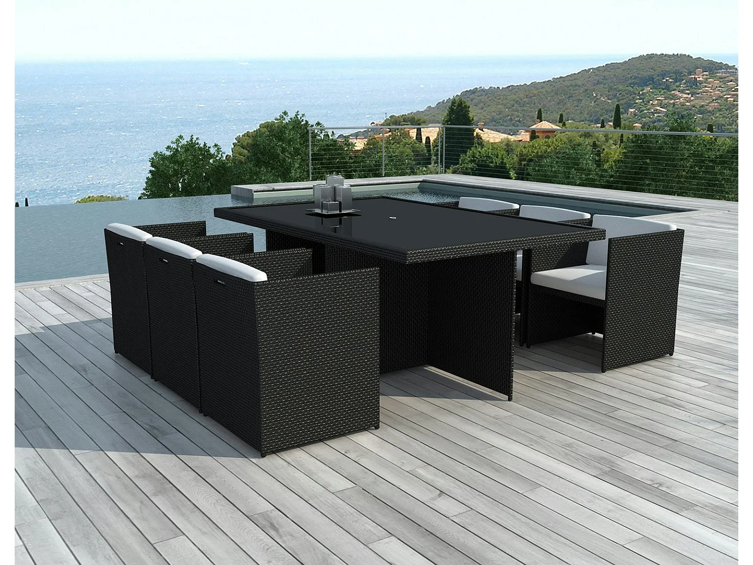 Ensemble de Repas ARGELES 7 pièces encastrables 175x115cm en résine tressée noire et coussins tissu blanc écru