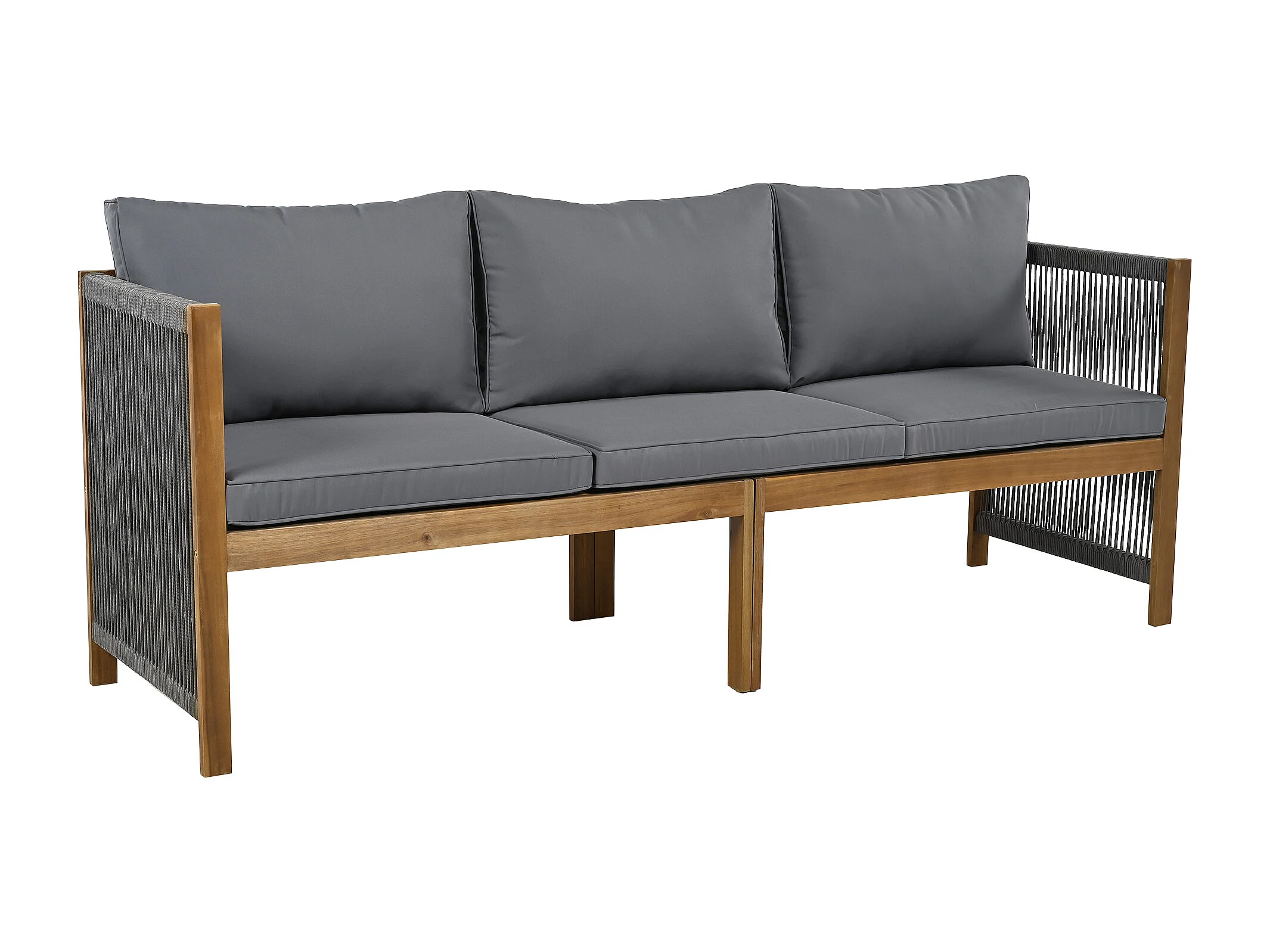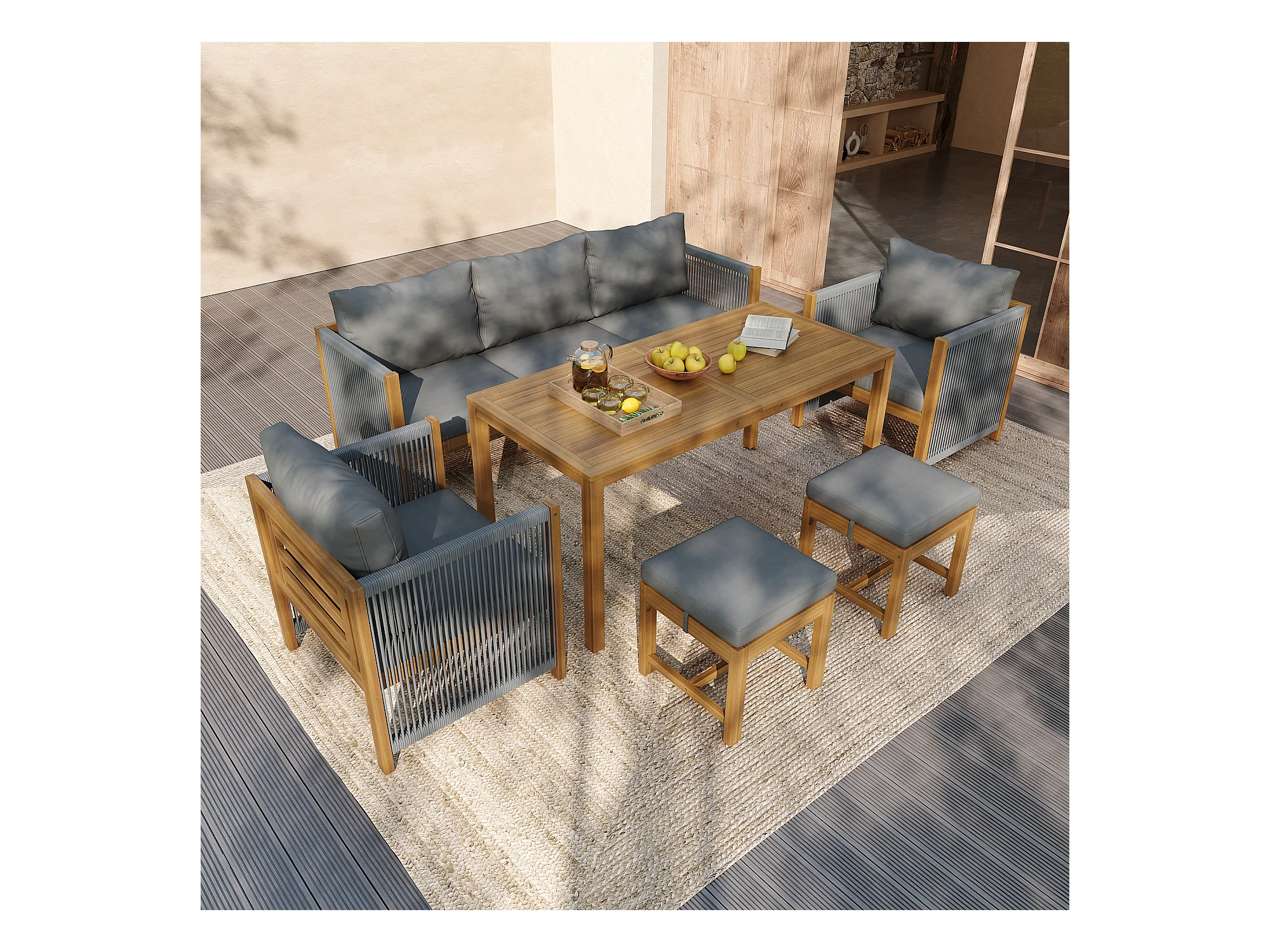 Ensemble de salle à manger de jardin pour 7 places, canapé, 2 canapés simples, 2 tabourets, table à manger, plateau en acacia, acier galvanisé, gris