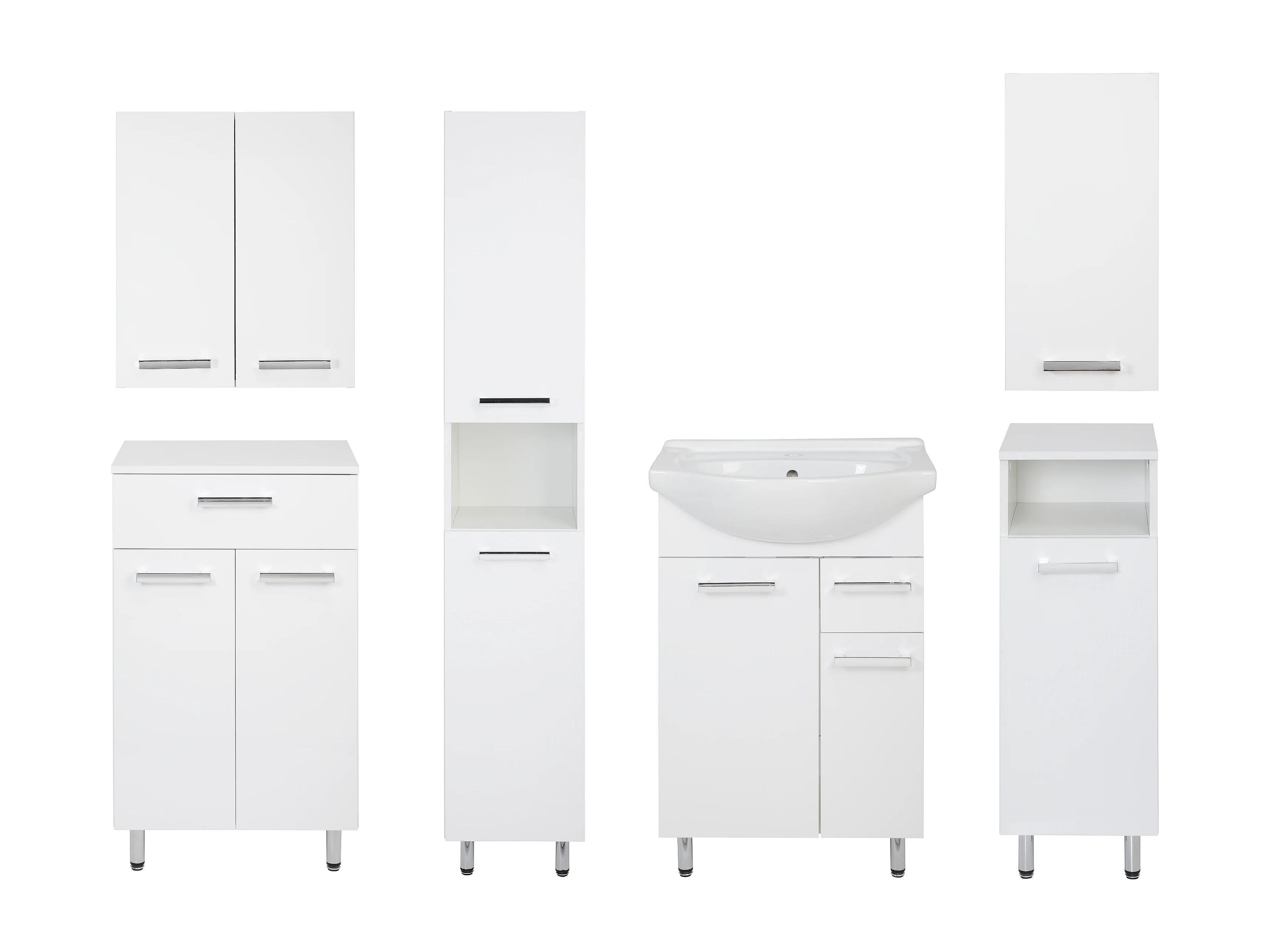 Ensemble de salle de bain blanc sur pied 55 cm Armoire avec lavabo Colonne Demi-colonne Commode Armoires supérieures Lupo