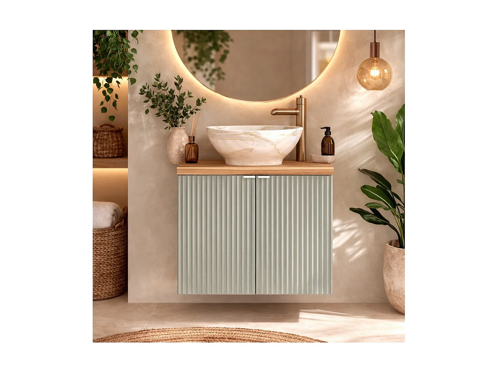 Ensemble de salle de bain ELVINA 60cm : meuble sous vasque à placards vert sauge gris + plan pour vasque aspect bois foncé