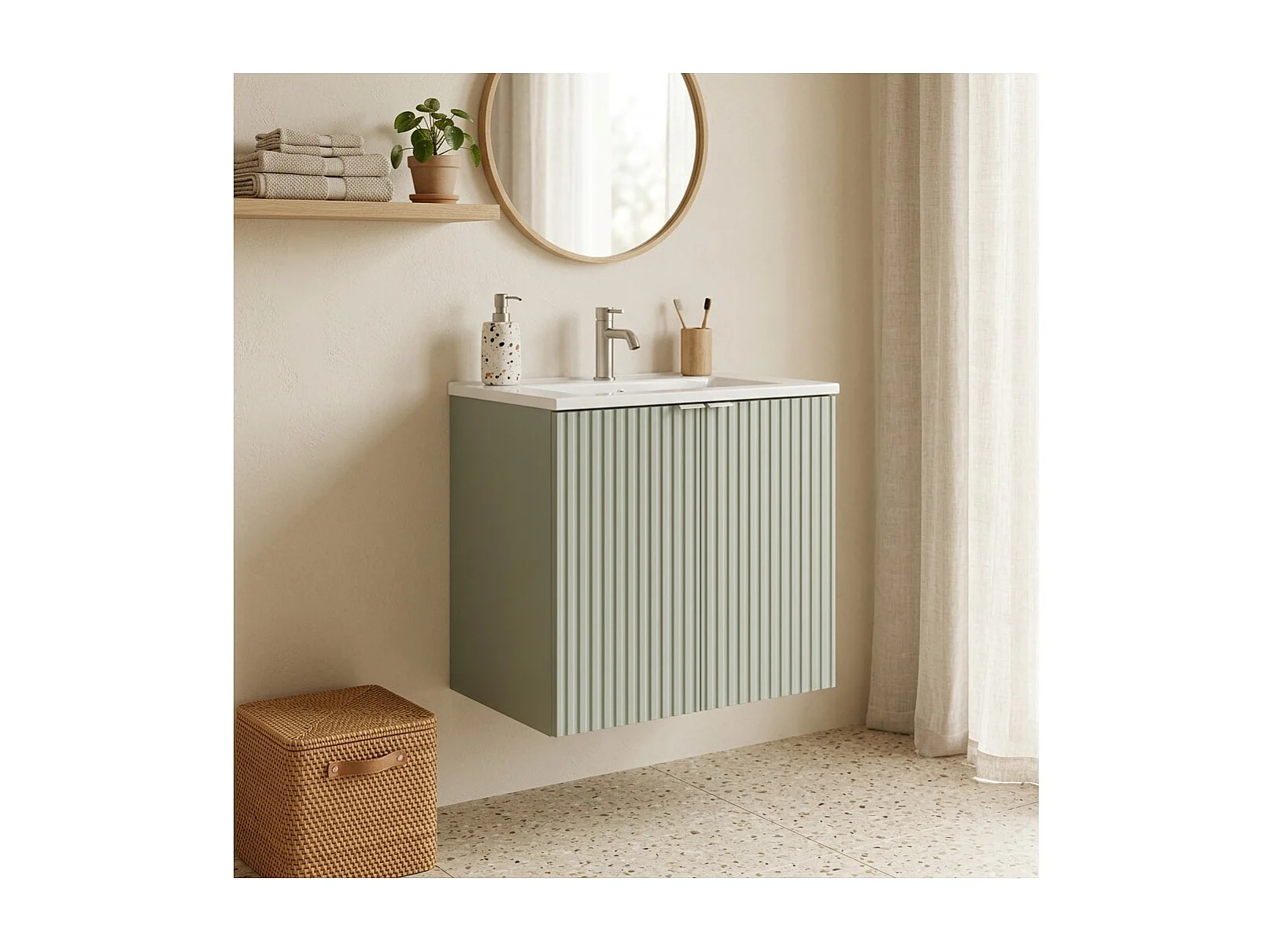 Ensemble de salle de bain ELVINA 60cm : meuble sous vasque à placards vert sauge gris + vasque encastrée blanche