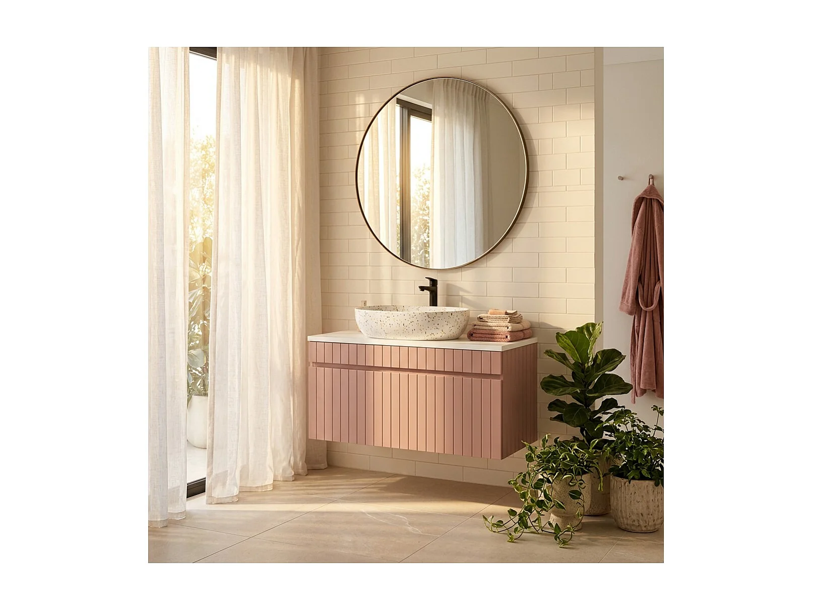 Ensemble de salle de bain ICON : meuble sous vasque 100cm rose poudré + plan pour vasque blanc