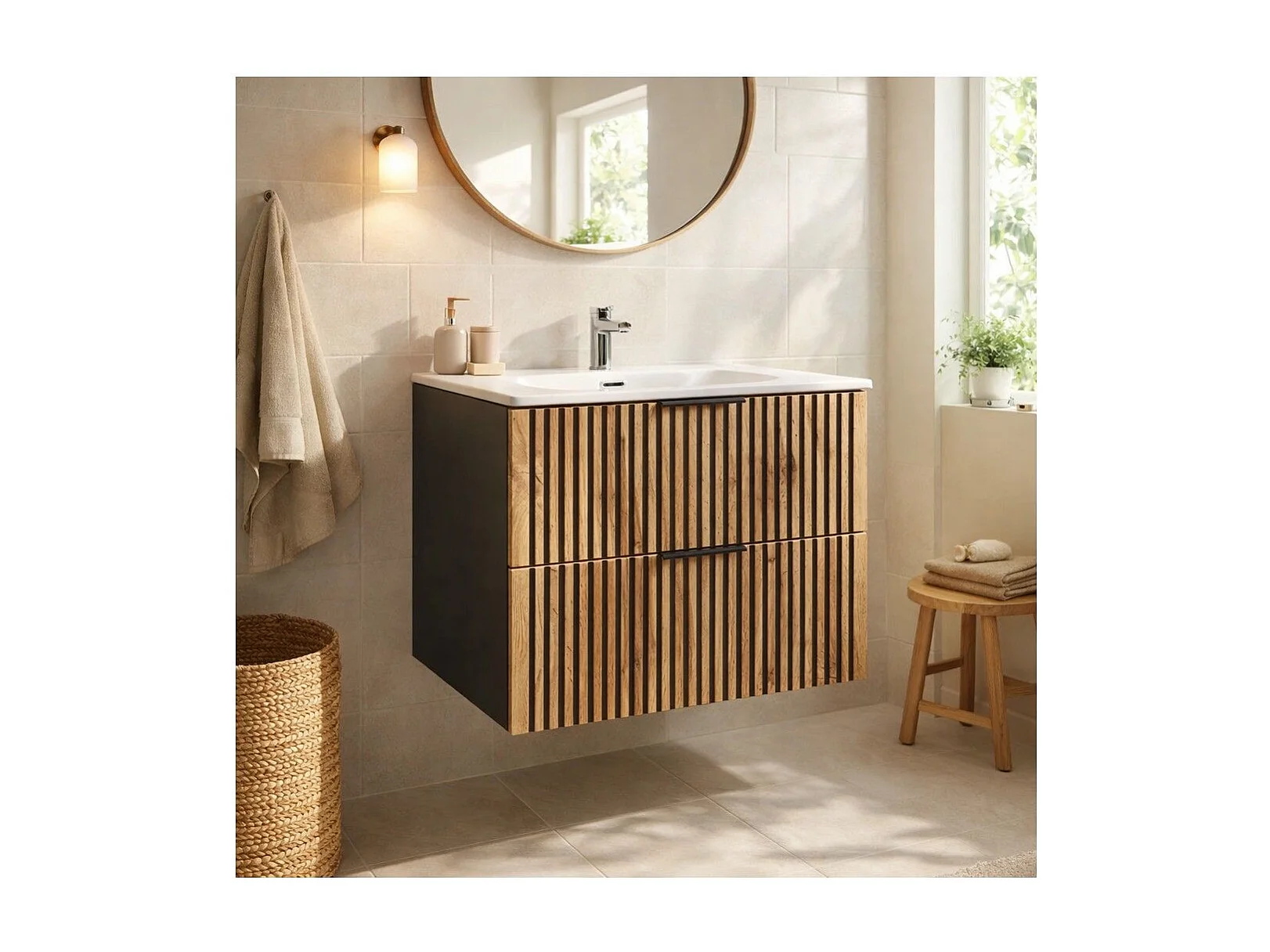 Ensemble de salle de bain KINOKO : meuble sous vasque à tiroirs 60cm + vasque à encastrer blanche + siphon