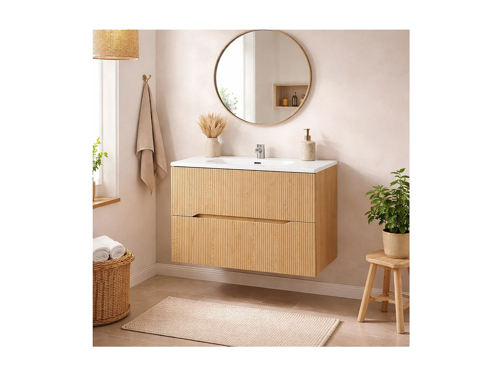 Ensemble de salle de bain NATURA 80cm : meuble sous vasque aspect bois clair rainuré verticalement + vasque encastrée