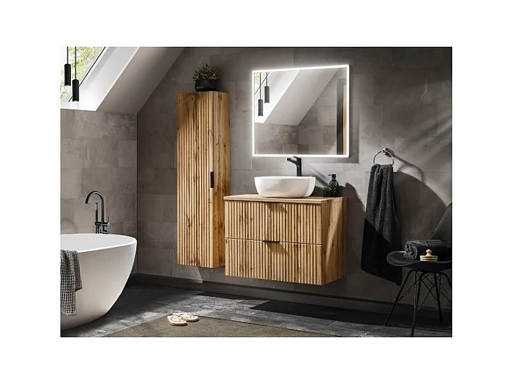 Ensemble de salle de bain NOXERA 80 cm – Chêne wotan – Meuble sous vasque avec vasque, miroir LED et colonne suspendue