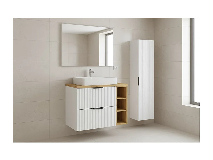 Ensemble de salle de bain NOXERA 80 cm – Meuble sous vasque suspendu blanc alpin avec plan vasque chêne clair, niches ouvertes e