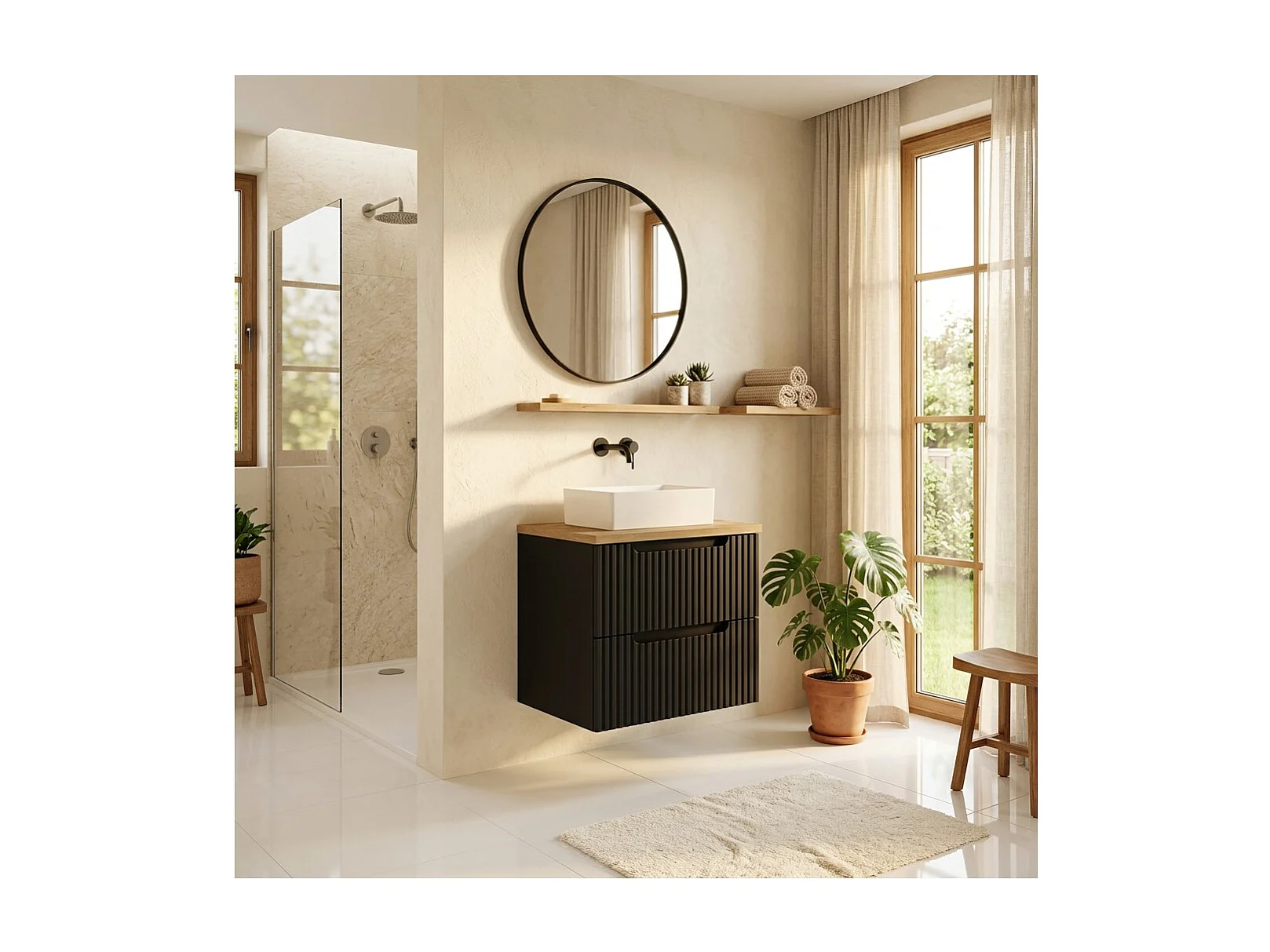 Ensemble de salle de bain suspendu VANO 50cm : meuble sous vasque à tiroirs rainuré + plan pour vasque aspect chêne clair