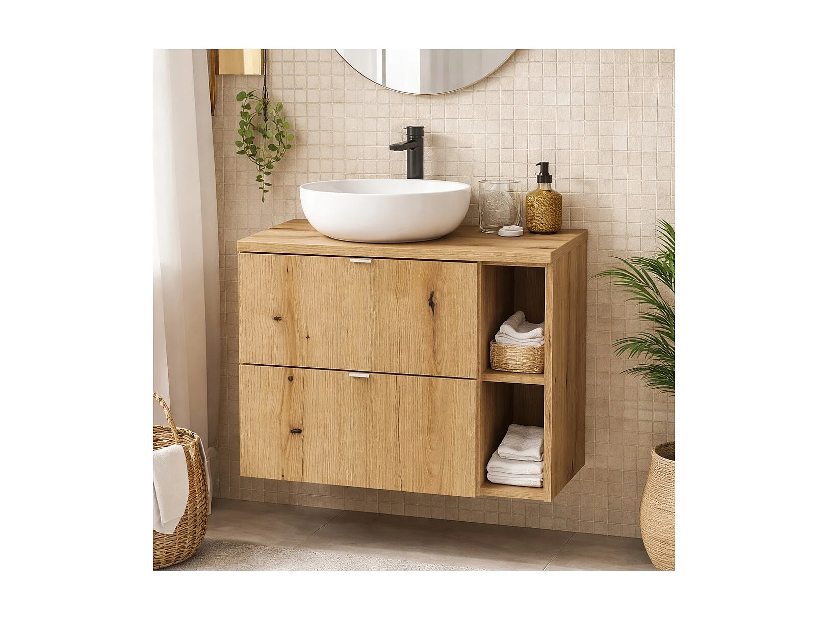 Ensemble de salle de bain suspendu VANO aspect chêne 80cm : meuble sous vasque à tiroirs + niches visibles + plan pour vasque
