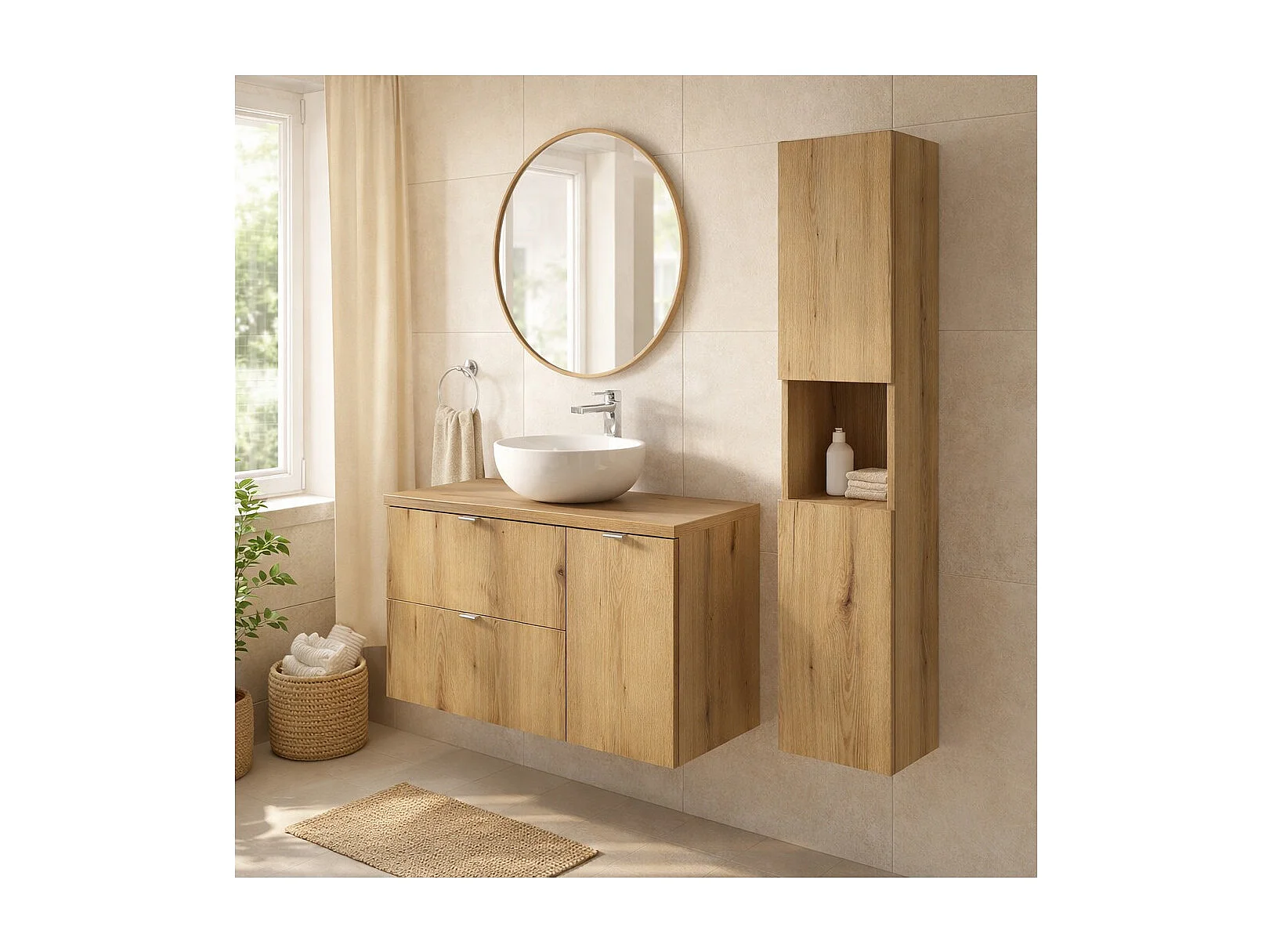 Ensemble de salle de bain VANO aspect chêne 120cm : meuble sous vasque à tiroirs et placards + plan pour vasque + colonne