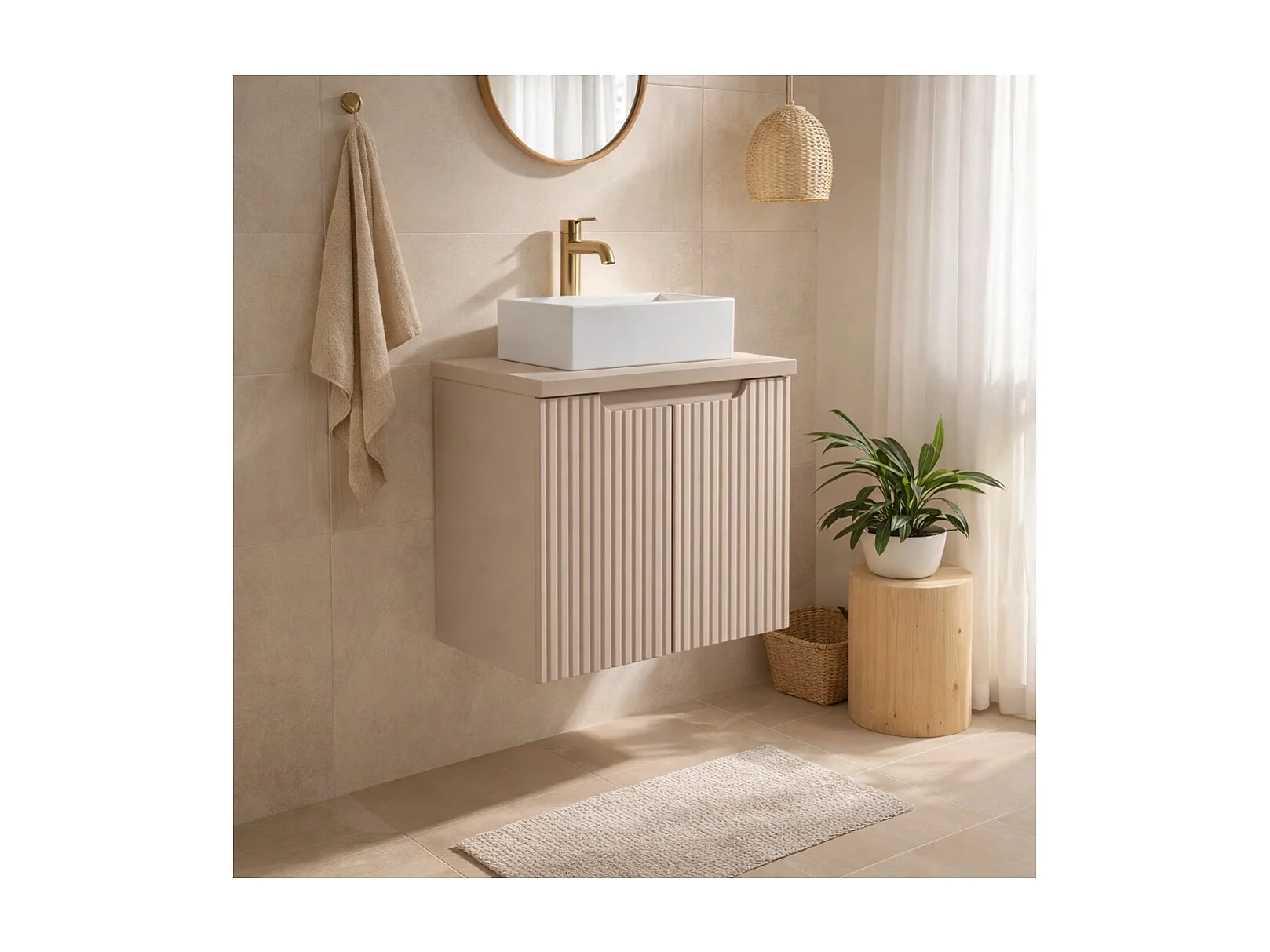 Ensemble de salle de bain VANO cachemire mat 50cm : meuble sous vasque à placards rainuré verticalement + plan pour vasque