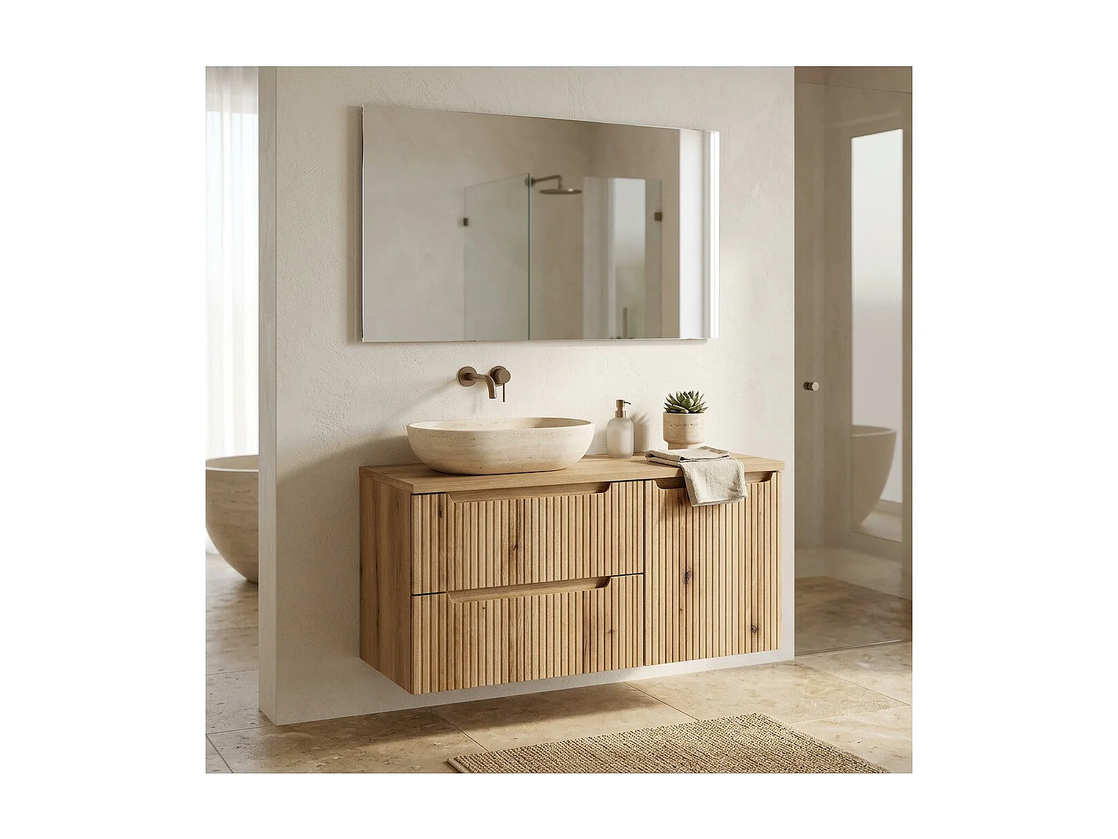 Ensemble de salle de bain VANO chêne clair 100cm : meubles sous vasque à tiroirs avec panier à linge intégré + plan pour vasque
