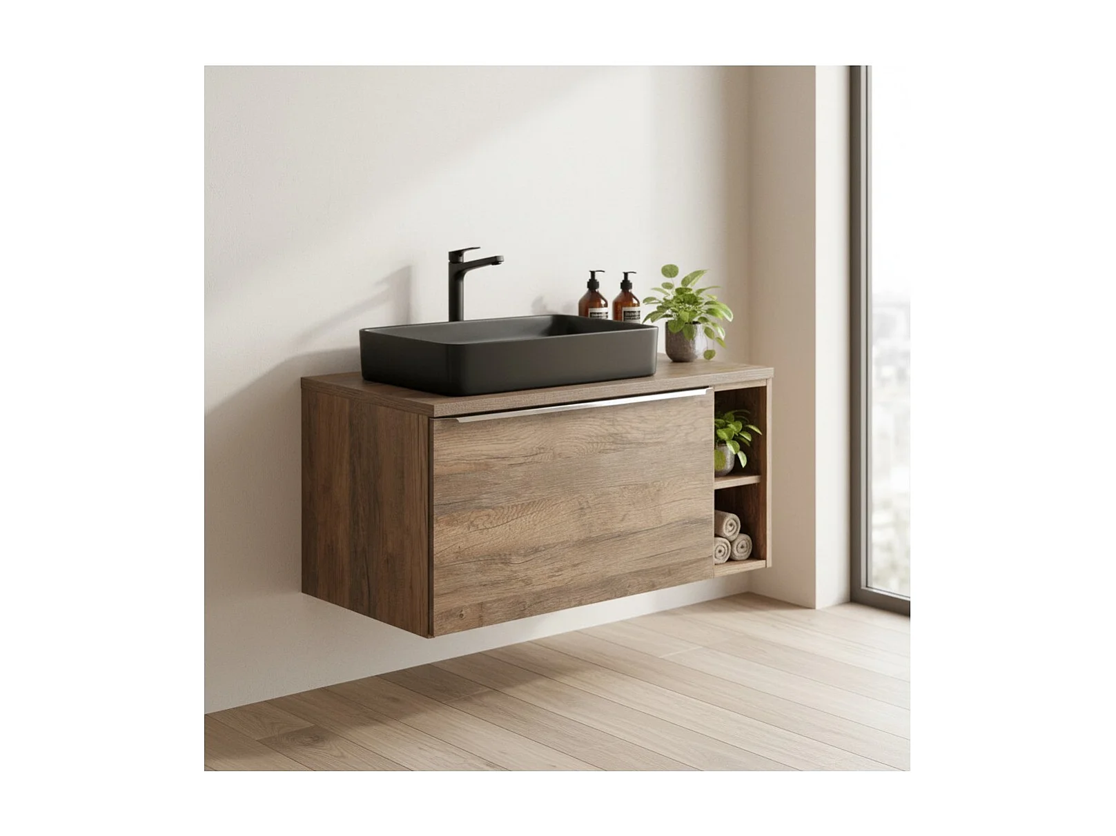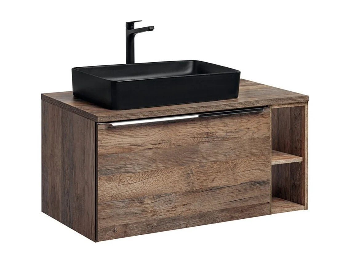 Ensemble de salle de bain VANTA chêne : meubles sous vasque 100cm + plan vasque + 1 vasque noire à poser